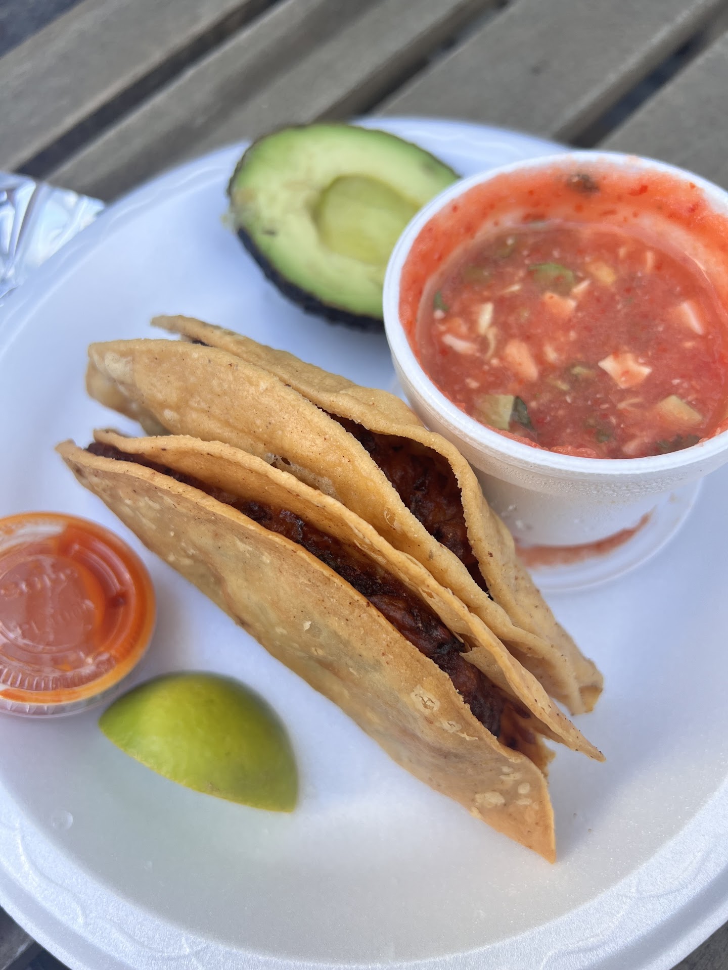 Don't be fooled by the street and the surrounding area. I was hesitant the first time but let me tell you those shrimp tacos are absolutely worth it. I think they chop up the shrimp, Mix it with other ingredients and then deep fry the entire taco. It is served with a really fresh salsa, some avocado and it's absolutely phenomenal. I highly recommend getting at least two per person (shh I could eat four!)