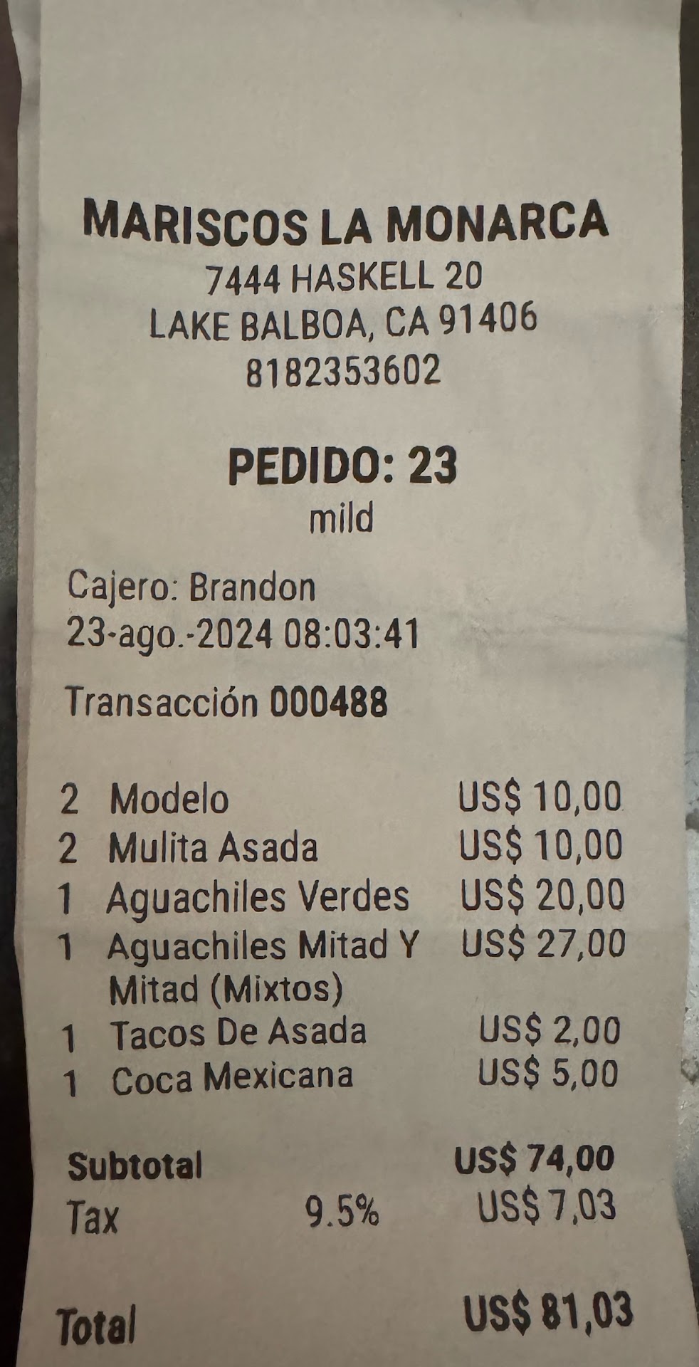 It’s a food truck but wow these know seafood right!! ON HASKELL CORNER W SATICOY. We got there 8pm and next to this seafood truck another taco guy was setting up. This stays Open late sometimes until 3am. Aguachiles are on key! Delicious and you can ask for them on spicy level. I’m eat very spicy and I asked for Medium spicy to see but not spicy at all for me. See my receipt. I Will be back! They take tap pay and Zelle. Cashless truck. Smart!