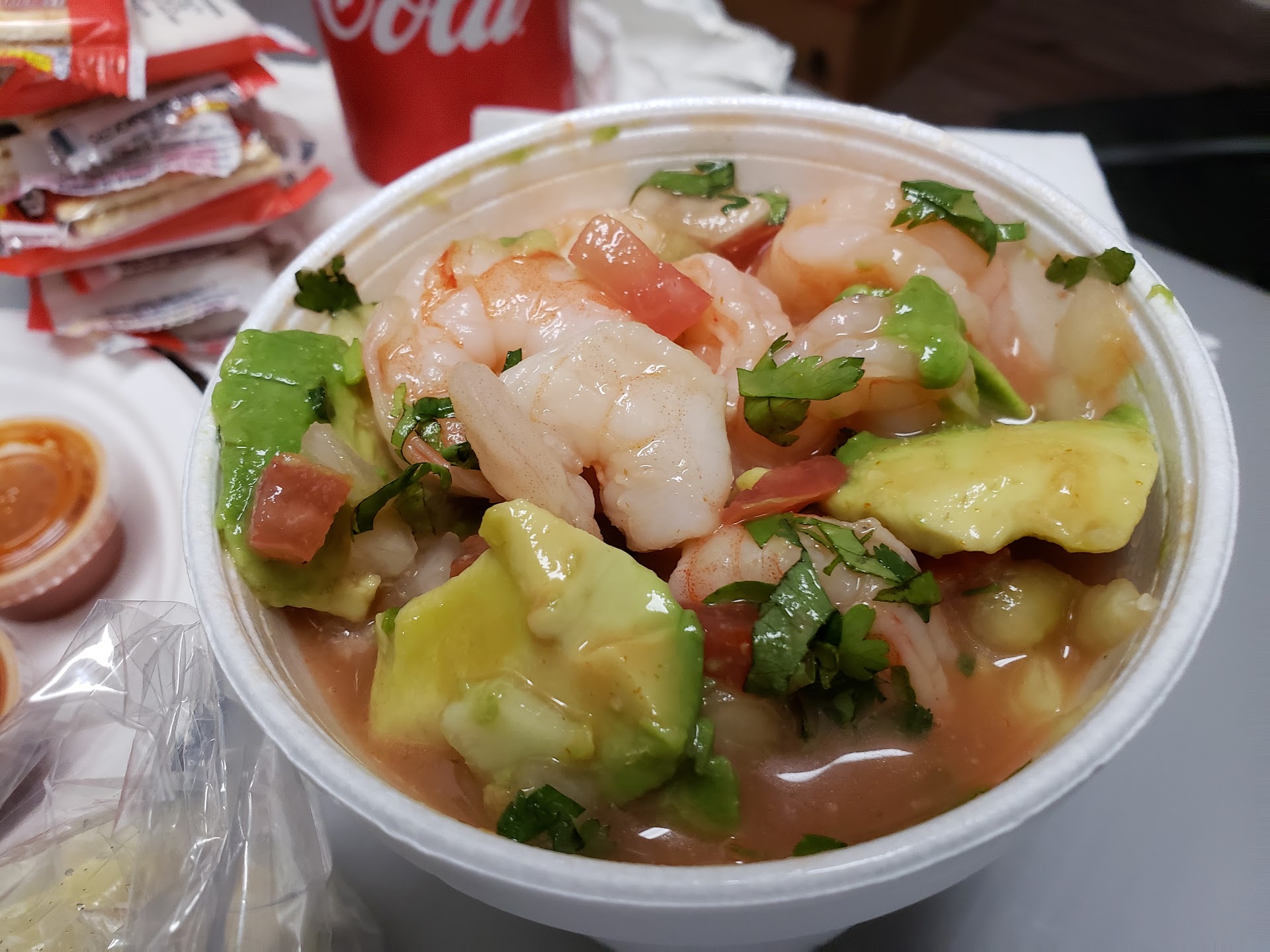 I had the hankering for some ceviche and shrimp cocktail. I found this little place in Wilmington CA, which looks like there's still many more around. The parking lot was a pain since it was a small lot and was already full. I ordered both the ceviche and shrimp cocktail, I got a small container of Ceviche de Pescado ($5 and some change) and a med size serving of the Shrimp Cocktail ($9 and some change). I must say they were both delicious!!