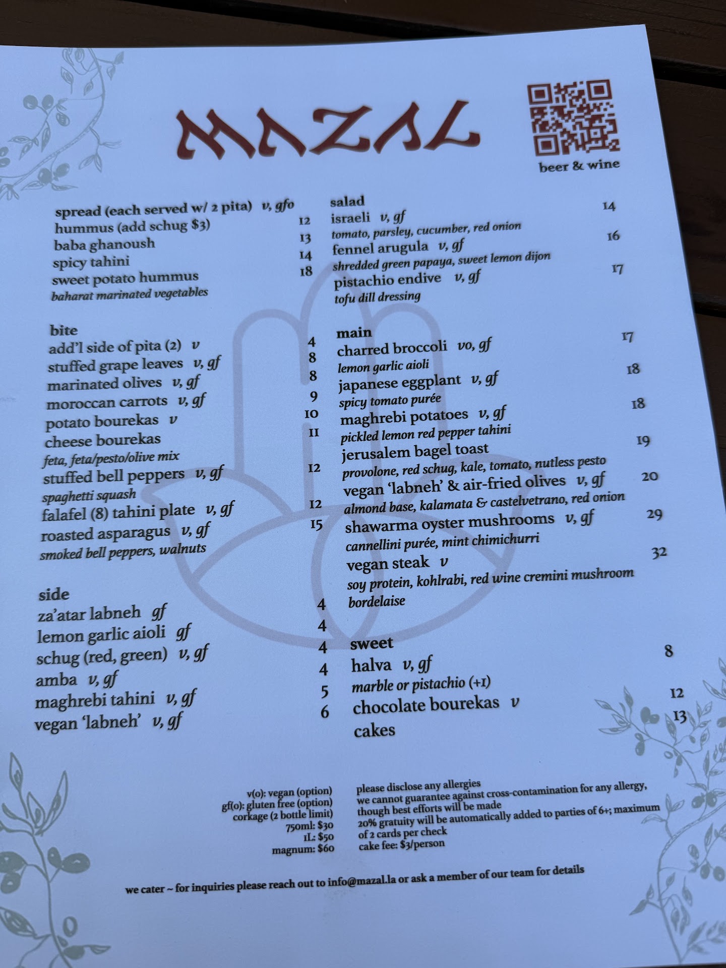 -Black sesame tahini -Pita -Marinated olives -Maple Cottage Mousse -Charred Broccoli -Hamin -Vanilla Halva