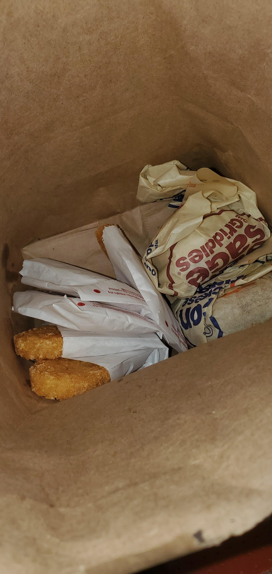 Unfortunately, out of 4-6 curbside spots, all were occupied except 1 space (so at least there was a space for me), but in the time it took me to get my really long vehicle into the space, park, get comfortable in my seat, order using the app, wait a few minutes for my food to be brought to me, and arrange my food and myself to get driving again, I believe only one of those cars moved. I was sitting there for at least fifteen minutes, if not more, because I took a long time to decide what I wanted.
