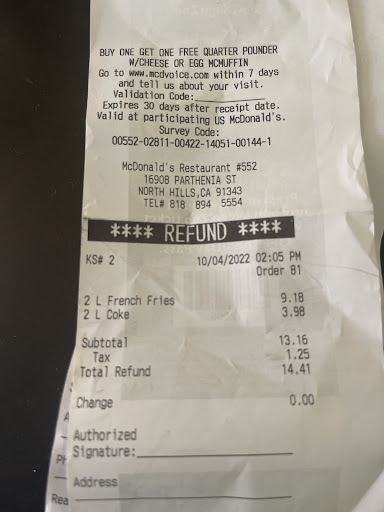 Read moreI've been a customer of this particular location ( Balboa/ Parthenia) in North Hills for 20 years now; it used to be decent, but that was before ALEX came to work there! Karen, the wonderful manager left and now there's "manager Alex". He is rude, mean and unprofessional. Somebody accidentally dropped her fries the other day and he was soooo RUDE AND MEAN to her; people were just looking at him with disbelief on their faces.. He is disorganized, and staff takes forever to take your order at the drive-thru whenever he's around; he doesn't care, and it shows. I'll cut down from supporting this location-I'll go from five days a week down to one and hopefully never have to see him again. Come on, it's McDonald's. It's supposed to be quick and easy; not with...