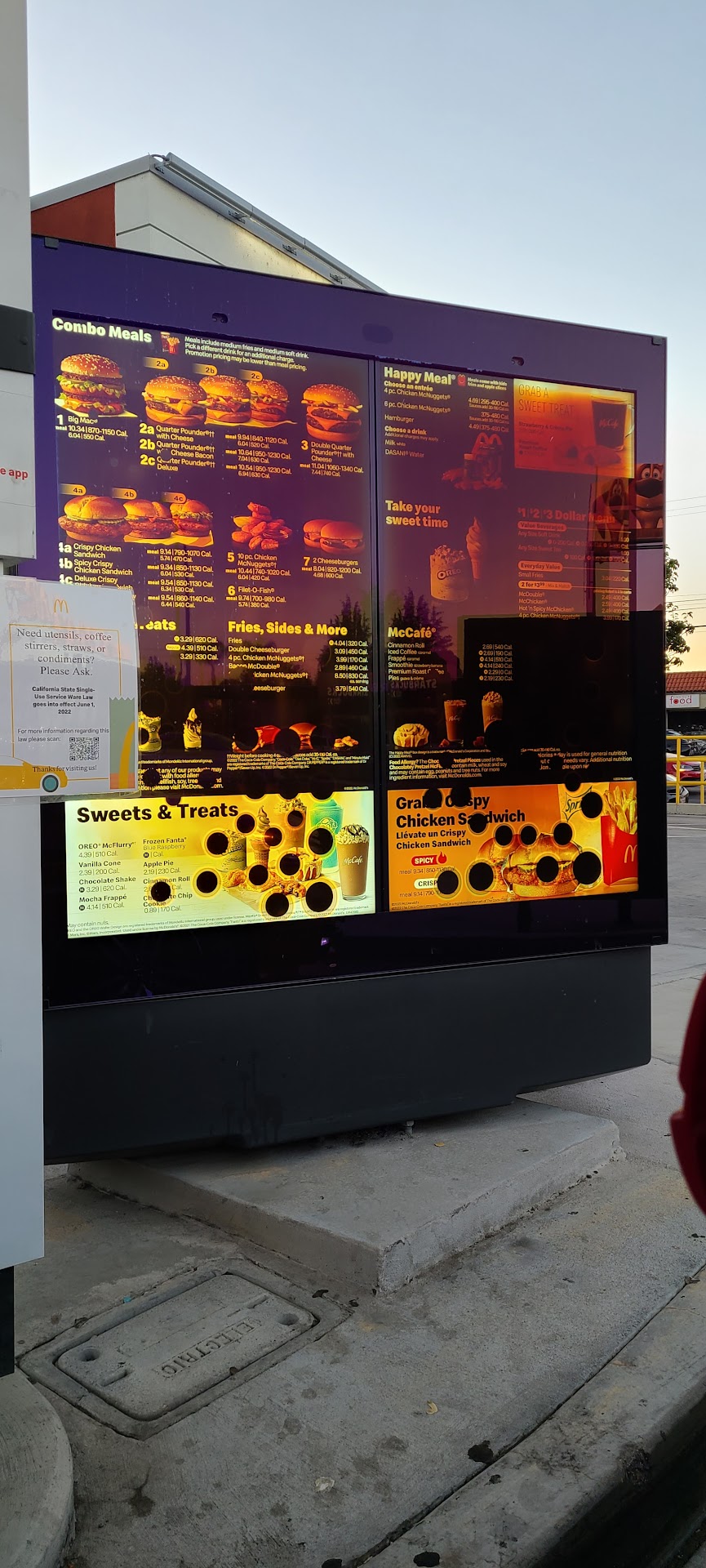 Read moreRaised prices in non-compliance with all but ONE location in the Valley (and that location is under same management/ownership) Cheapened items they have some control over, like the $5.00 salads are about 3/4 the amount of lettuce they were just a few weeks ago. I complained about this, and they acted like I was crazy. Iced Coffee is $1.00 MORE for the Large size here than at any other location other than the one in Tarzana, referred to above. They have turned off the circuit breakers that control voltage going out to the AC outlets scattered around the walls, and under some of the tables, that were SPECIFICALLY installed to give customers the ability to re-charge cel phones, etc, and to go on the advertised free wi-fi, without discharging their laptop batteries. This is shockingly negative and total cheapskate policy. They have taken to arbitrarily closing the dining lobby EARLY. some days as much as 2 hours early. A local customer can no longer depend on the posted door hours at this McDonalds. TOTALLY UNPROFESSIONAL AND UNBUSINESSLIKE.