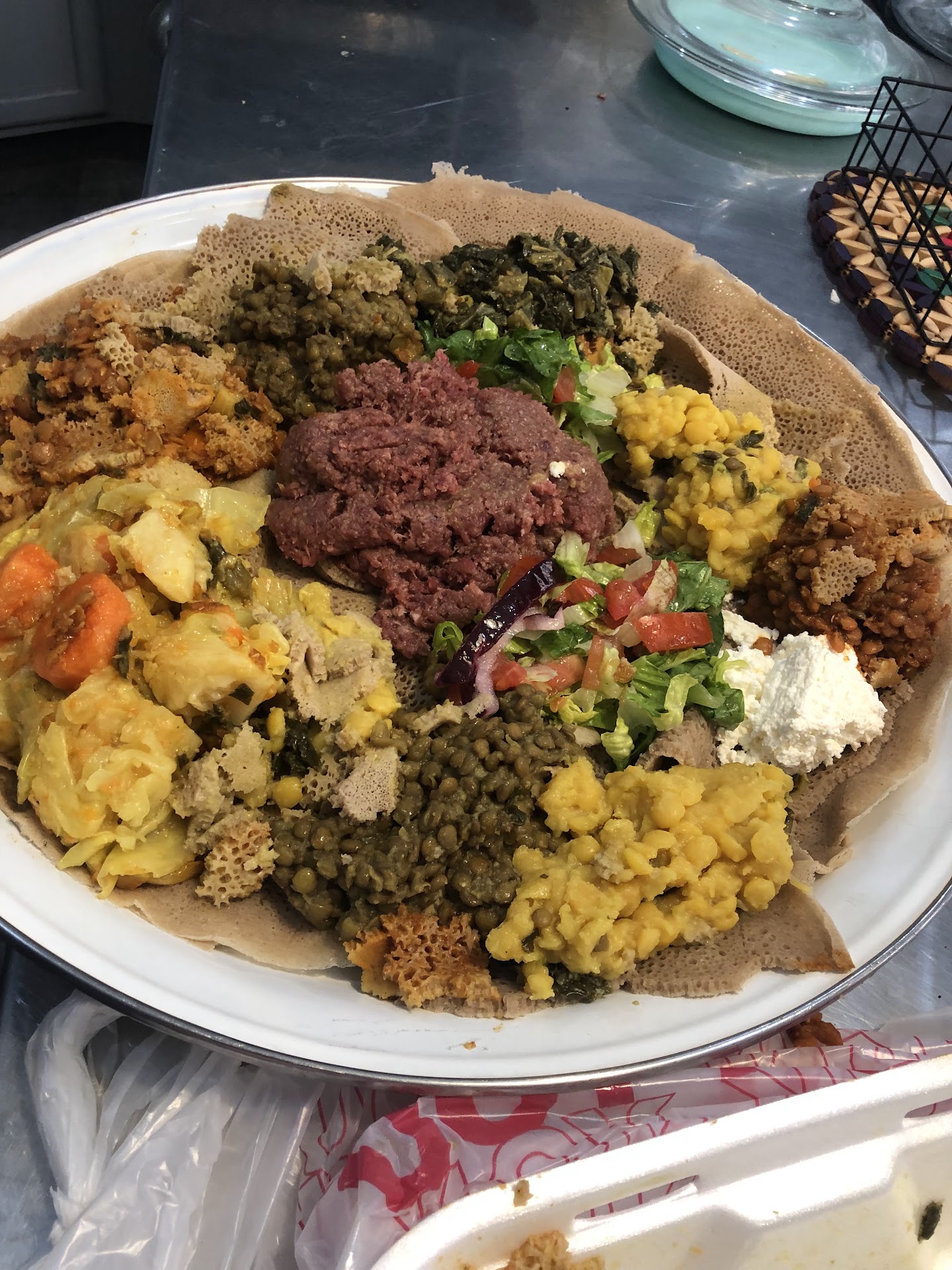 At Merkato, all the dishes you order are combined into one large communal platter and then presented with the vegetables surrounding the meat (if meat is ordered). Utensils are absent in Ethiopian cuisine. A sponge-like pancake called injera acts as the spoon. The injera should be ripped apart and then scooped into the meat/veggies. Don't be shy to get dirty. Don't be afraid to use up all the injera, it can be refilled. Don't ask for forks and spoons - suck it up and experience the Ethiopian culture.