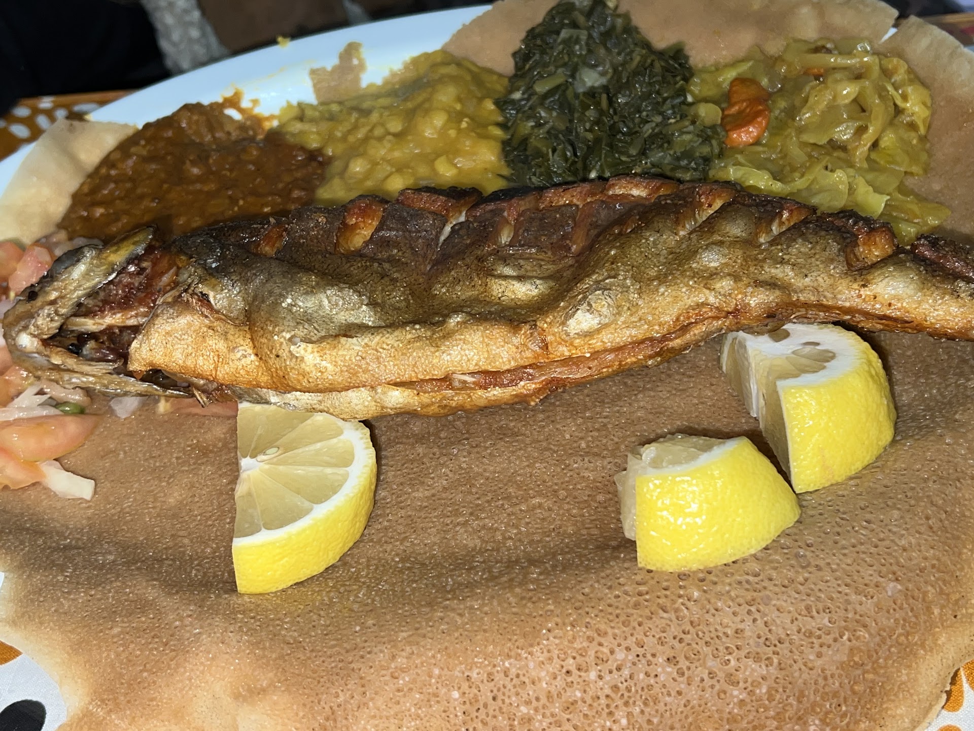 This was my first time experiencing Ethiopian food. We ordered: #13 Assa Tibbs (whole white fried trout Ethiopian style with vegetable sides) #14 Yebeg Sega Wot, Yebeg Alicha (braised beef and lamb stew) Tej (honey wine) Ethiopian coffee
