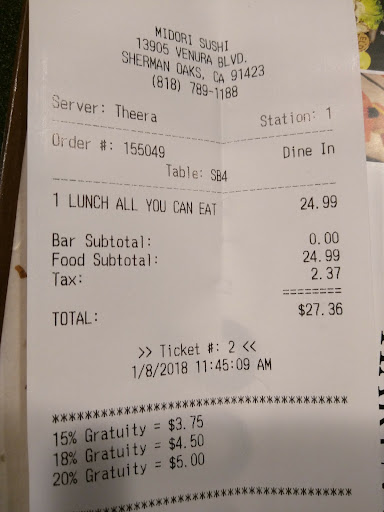 To the kid who served us: there are ways to inform customers without embarrassing yourself, no one comes to that restaurant with friends and family to be lectured, no one abused your policies and no sane parent would steal your sushi and give their kids raw fish to eat. Please use your brain mass, you just lost close to 8-10 customers in one go and most importantly, your considerable tip. I would not advise anyone to go to this Midori spot, try Encino one where the owner is almost on the site and she is the sweetest lady that will make your visits very enjoyable (without exception, she sends fried ice cream to our kids at every visit on the house; her hospitality is appreciated even by our kids who give her a hug...