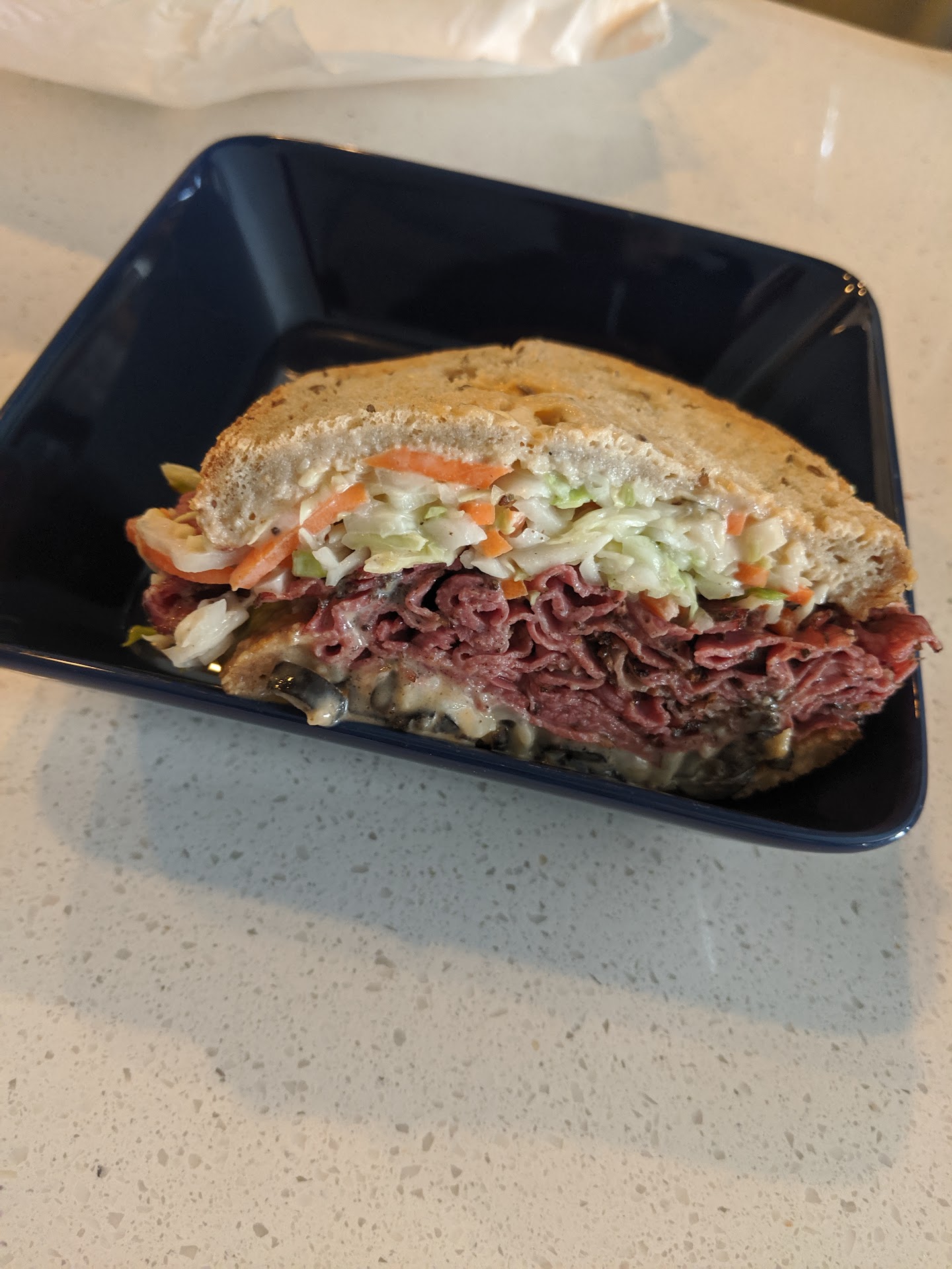 Read moreLet's see. Online - I ordered a hot New York Reuben on rye using pastrami brisket for pickup - the App said, ready in 15 minutes.