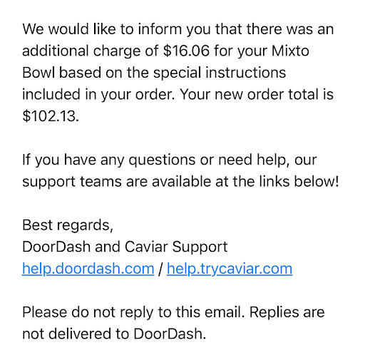 Instead, we received a message from DoorDash saying the substitution would cost $16 -- which felt excessive and confusing, especially since both bowls are priced the same on the menu. And there's nothing I could do. I contacted Door Dash and they said they could not substantiate what the charge was for.