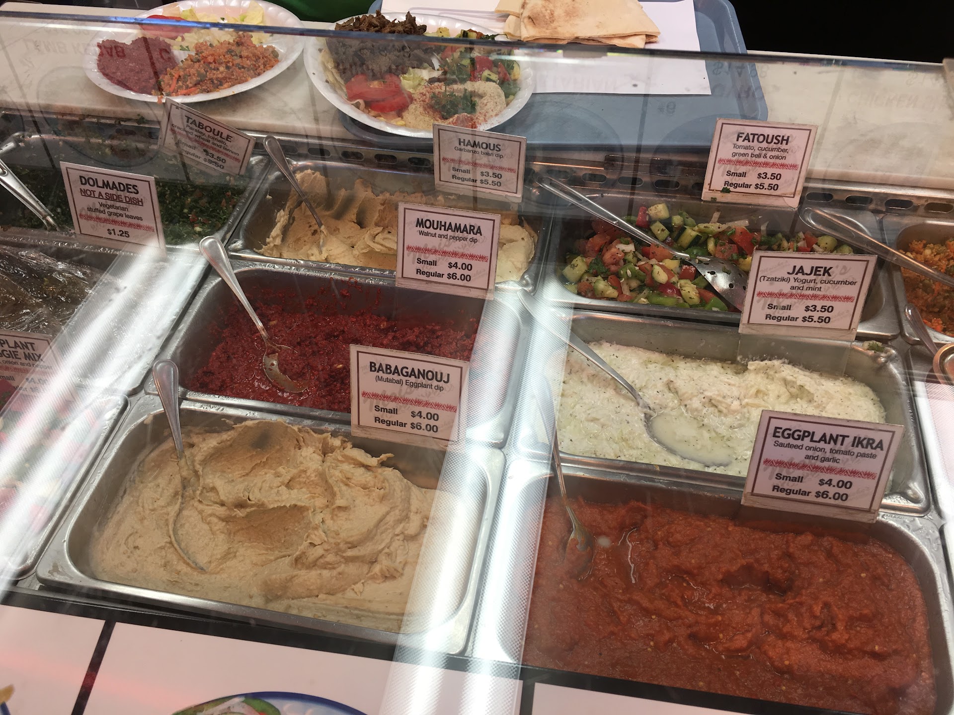 Falafel, gyros & other Middle Eastern staples served at a farmer's market counter.