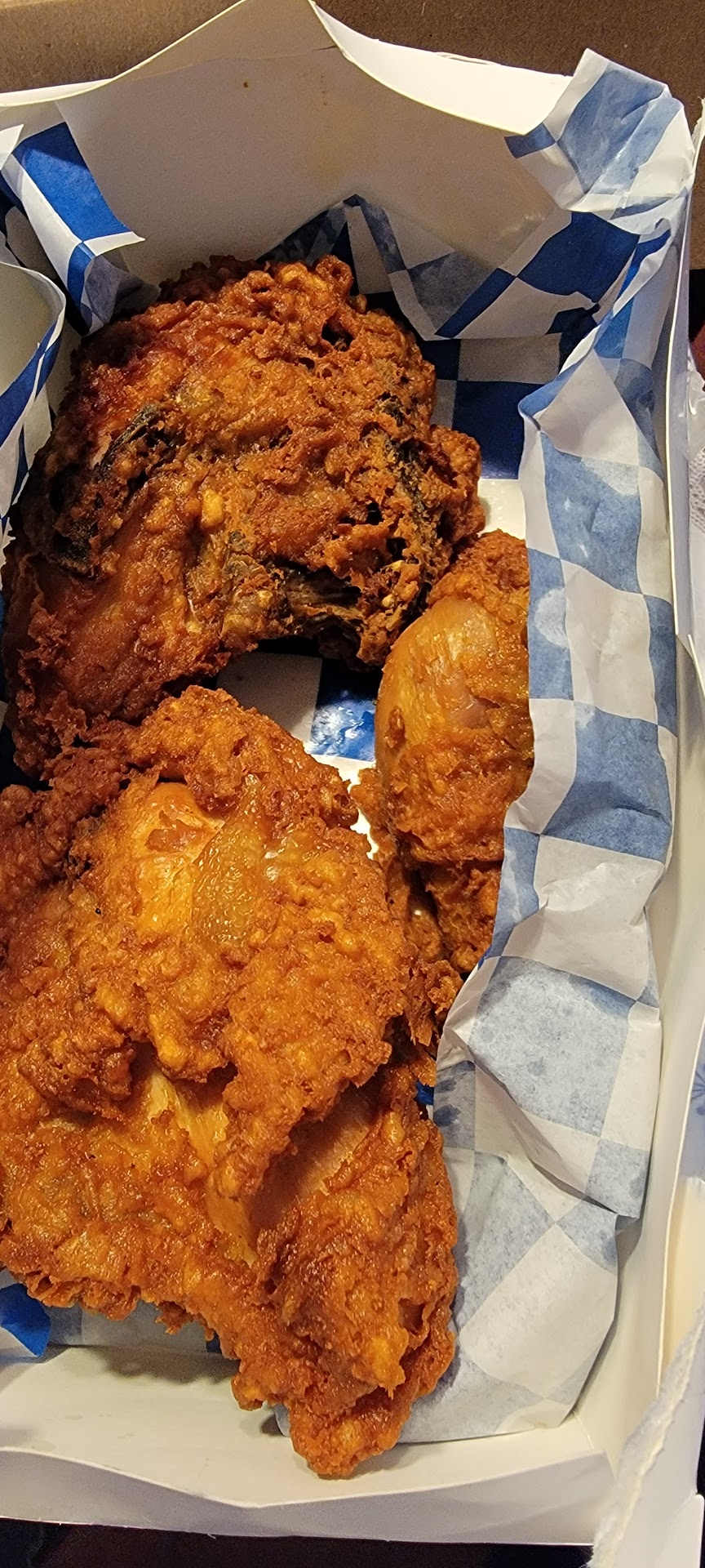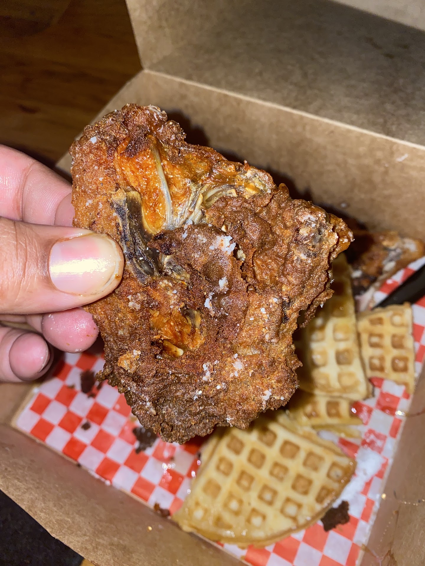 Read morePlaced order at kiosk and requested dark meat only. Order was immediately cancelled after paying for what I assumed was that I requested dark meat only. Placed second order without asking for all dark at it processed correctly. When notified to pick up my order I was told they were out regular chicken so they gave me all chicken tenders, which I'm not a fan of, and that's why they cancelled my first order. They wouldn't give me my money back and said I had to do it through the website. Anyway, frustrated, I took what they gave me and the chicken tenders were terribly dry, the waffles were very thin and tough, they didn't give me the honey butter, they gave me a huge order of french fries which I didn't want. Super unsatisfied and I probably won't go again. Sadly, though, I bet the fried chicken...
