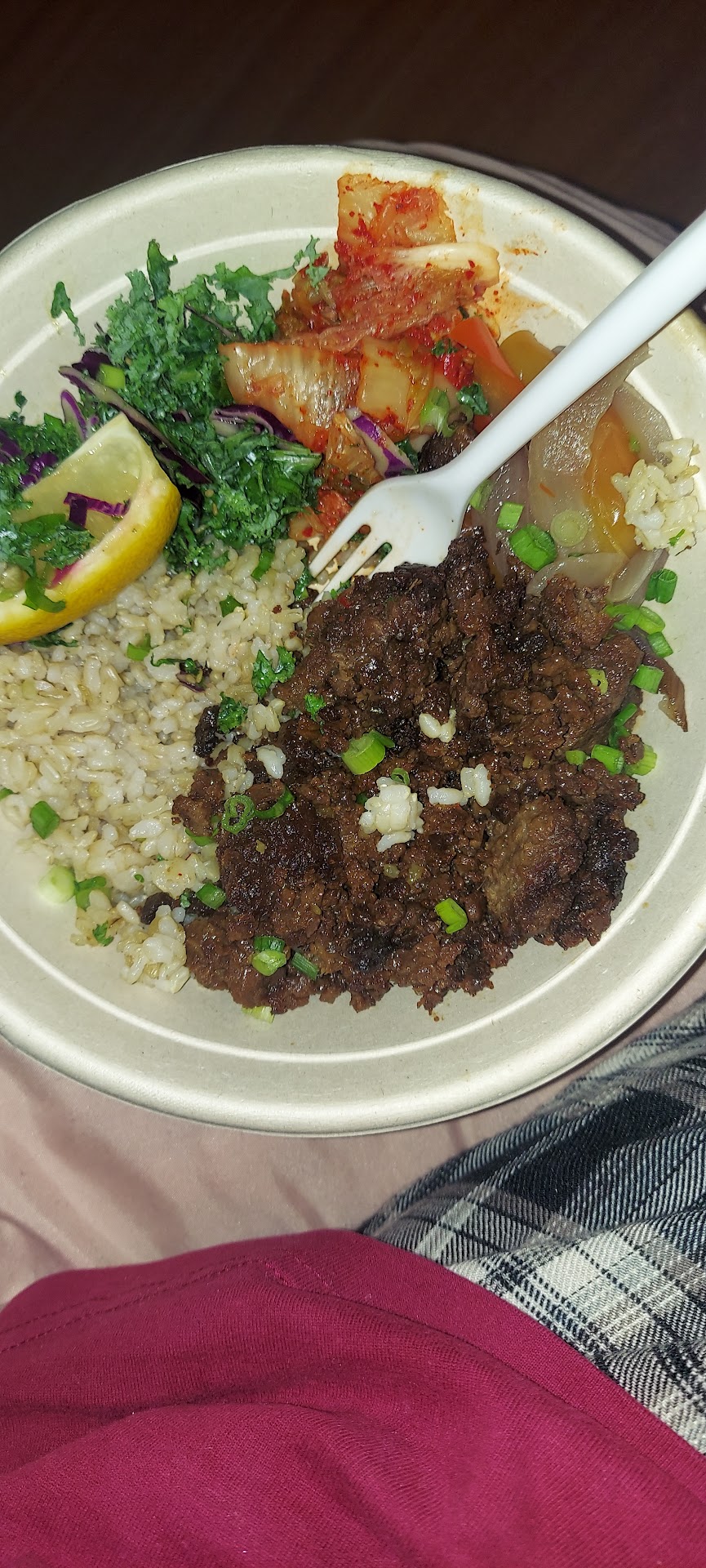 Ordered the Avo Impossible Bulgogi bowl with base of rice and added a fried egg. It was great, no complaints at all. A well balanced bowl with nothing overpowering in terms of quantity or flavors. Kimchi was yummy