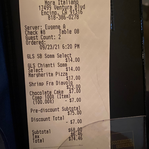 Our bill for Mora Italiano in Encino came out to a total of $74.46 plus tip. What a perfect night and I will say that Eugene helped to make the night even better as he took so much pride in the restaurant...