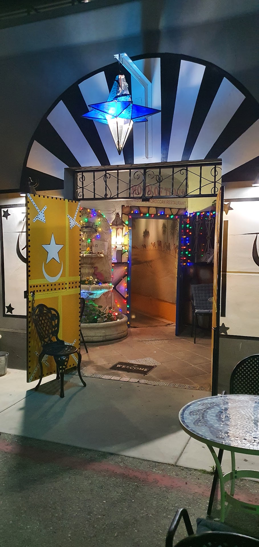 Read moreI love coming here and we usually come for birthdays since it is so special to our family. The atmosphere is wonderful as I like to feel like I am transported to another place if I can't actually go there at the time! The people know us and greet us in a very friendly way. Although it looks and sounds exotic, I think the food is not unusual for people who may be a bit timid to eat strange things. They have added to the original feasts so be careful how you pace yourself. The lentil soup is great but I don't finish it. The salads are chopped and most are delicious. They serve hot flatbread (not as flat as some other cultures) to scoop up the salads and grilled lamb. Yum! We get the Moroccan Feast because we love the Bistilla. It is a filo pie with chicken and scrambled eggs, topped with cinnamon and powdered sugar on top. We always forget and wear black so when you try to eat the hot pie and you breathe hard to cool it, the powdered sugar gets all over your top! By the way, someone said they give you wet towels, they do not. They give each person a dry, clean towel before they wash your hands and you use it as a napkin for the rest of the meal and you will need it!