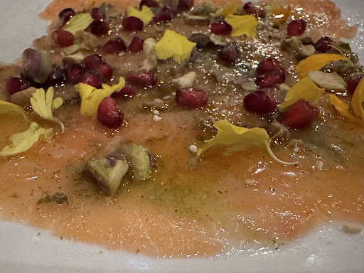 We started with the salmon carpaccio and sea bass skewers, both of which were delicious, but the sea bass skewers were absolutely next level. The fish just melted in my mouth! The chicken soup was also excellent, with a subtle hint of lime that added a unique touch.