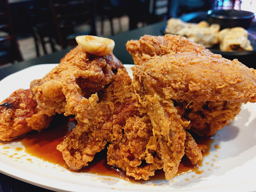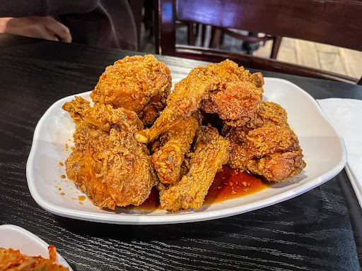 Read moreThis was a reasonable meal, but not top notch overall. But we didn't order any dumplings, so perhaps that would have made a difference. The banchan - the side dishes, were mediocre. But at least they provided some! Three dishes - an average kimchi, a very dull pickled radish (not a lot of flavor), and some shredded lettuce with thousand island dressing (not exciting). We had a half order of soy garlic fried chicken - very tasty, although you can't always tell what part of the chicken you are eating (they are cutting up the chicken themselves, which is not unusual). THe fried chicken is cooked very well and the coating is crispy, then they just dump whichever sauce you order on top. I would order this again. We also ordered bulgogi, which is a new dish and not on the regular menu. This was VERY good, I wish we ordered a full order instead of a half order (for two people). Very tasty. Servings were a bit small but reasonably priced. I did like that they are cooking everything fresh for you. Service was friendly and reasonably attentive. I guess I was just put off by the...