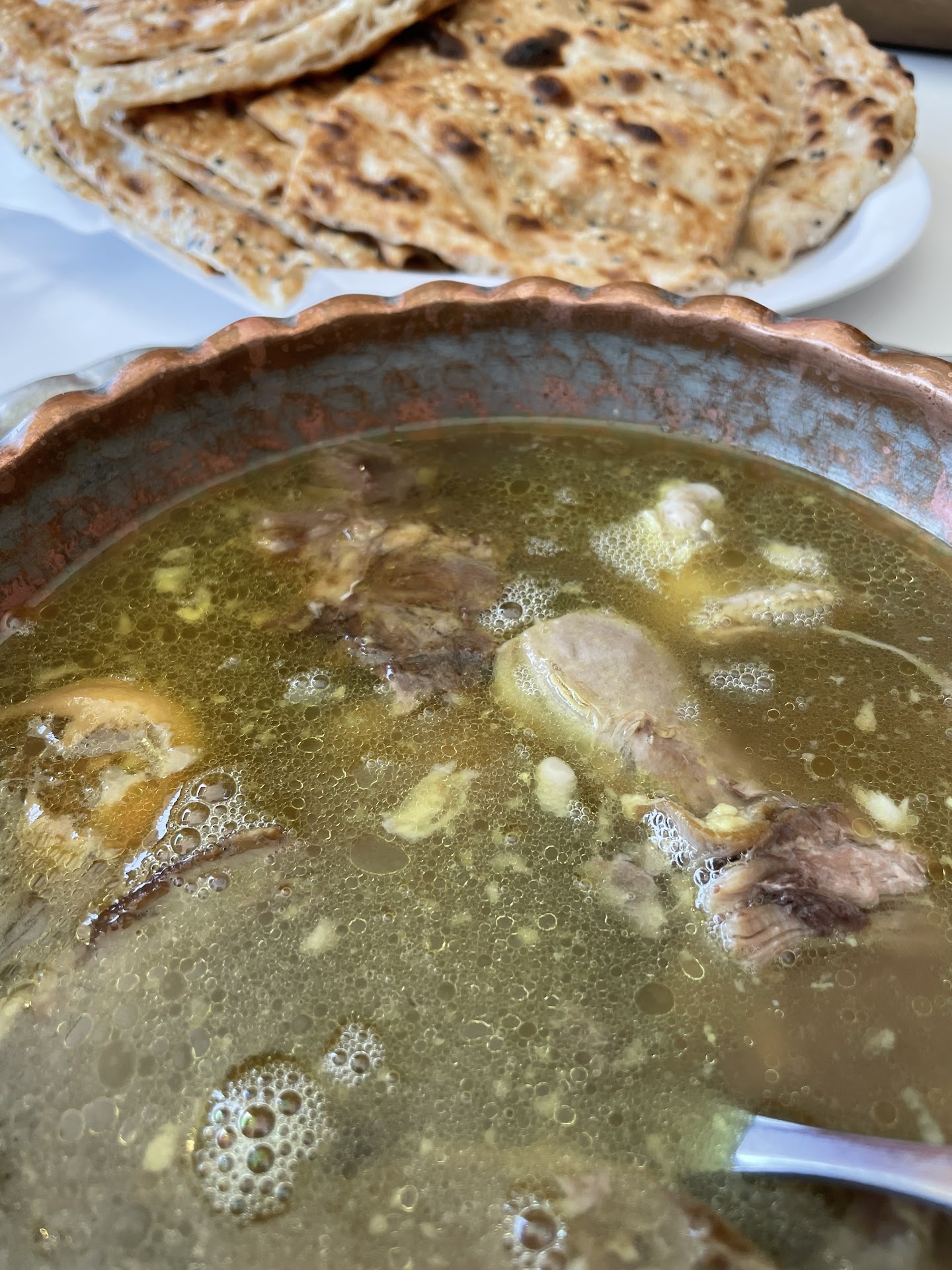 A noteworthy mention must be made of the Sangak bread that accompanied our meal. Fresh from the bakery, the Sangak was the epitome of perfectionâcrusty on the outside, soft within, and with a distinct, earthy flavor that can only be achieved in a traditional stone oven. The bread, in combination with the Kale Pache, created a harmonious symphony of flavors that was nothing short of remarkable.