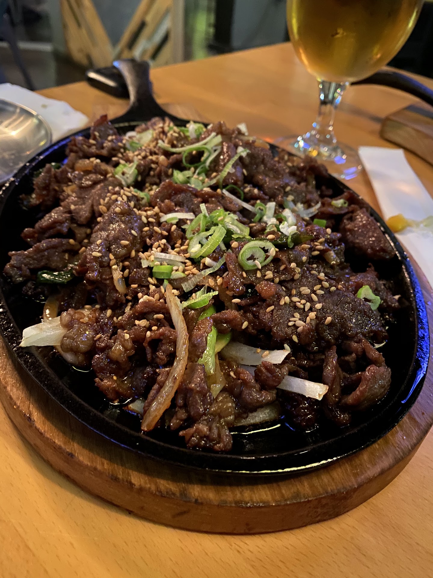 They have a pretty big food and alcohol selection. You can drink beer, wine, soju, or whatever you'd like here. The food menu is pretty big and has all your usual Korean bar favorites.
