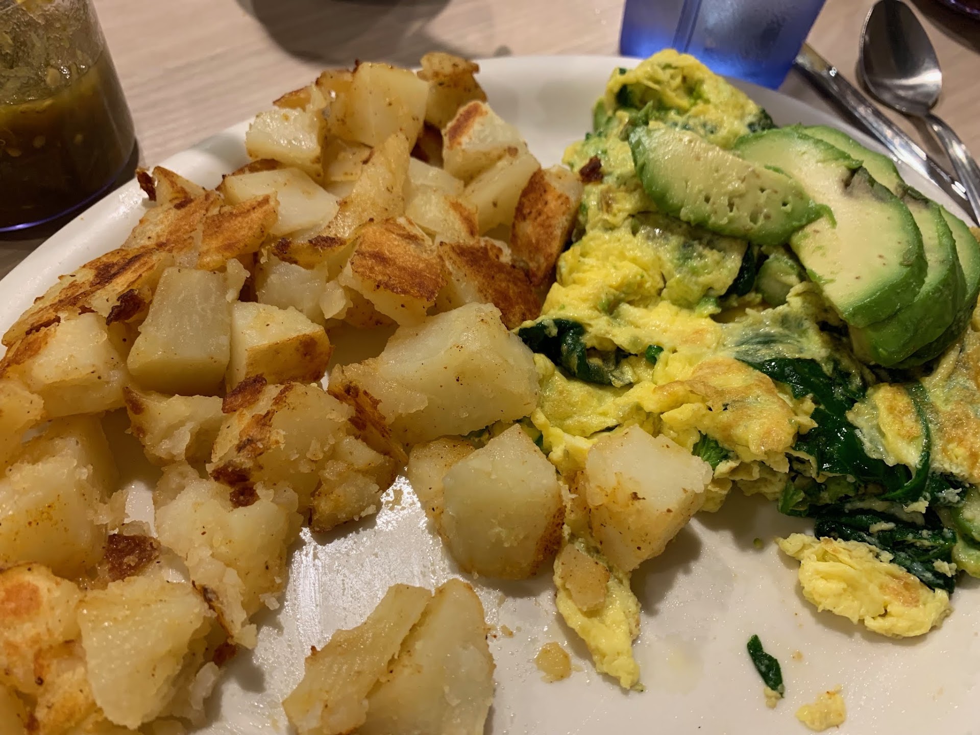 Two other folks in the party got the Special Green Omelet with home fried potatoes. The omelet was full of greens, topped with avocado and yummy…and the home fried potatoes were also done just as perfectly as the hash browns I got.