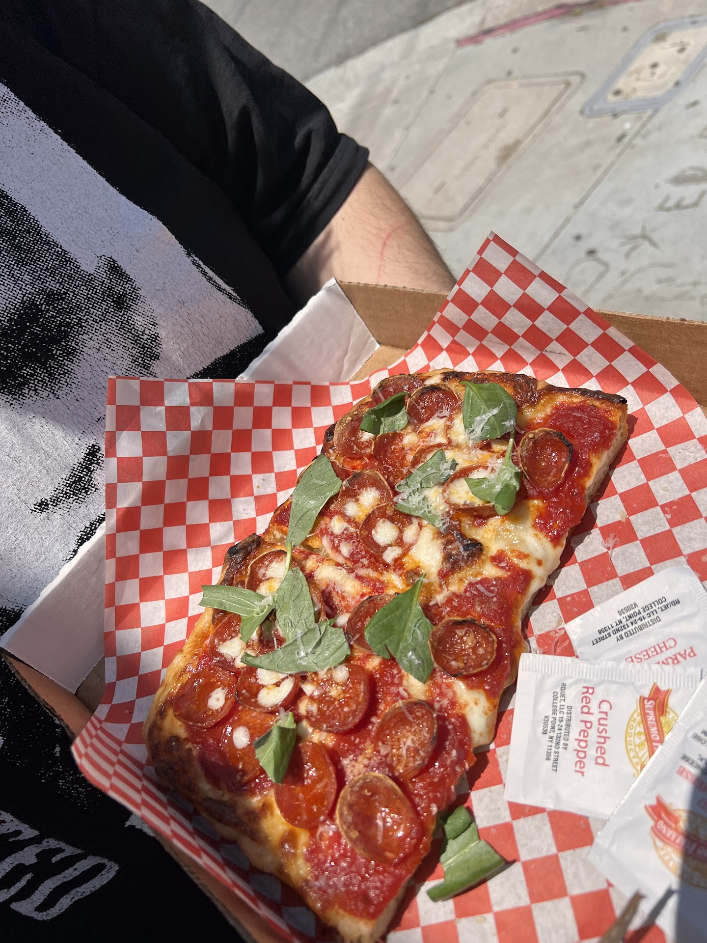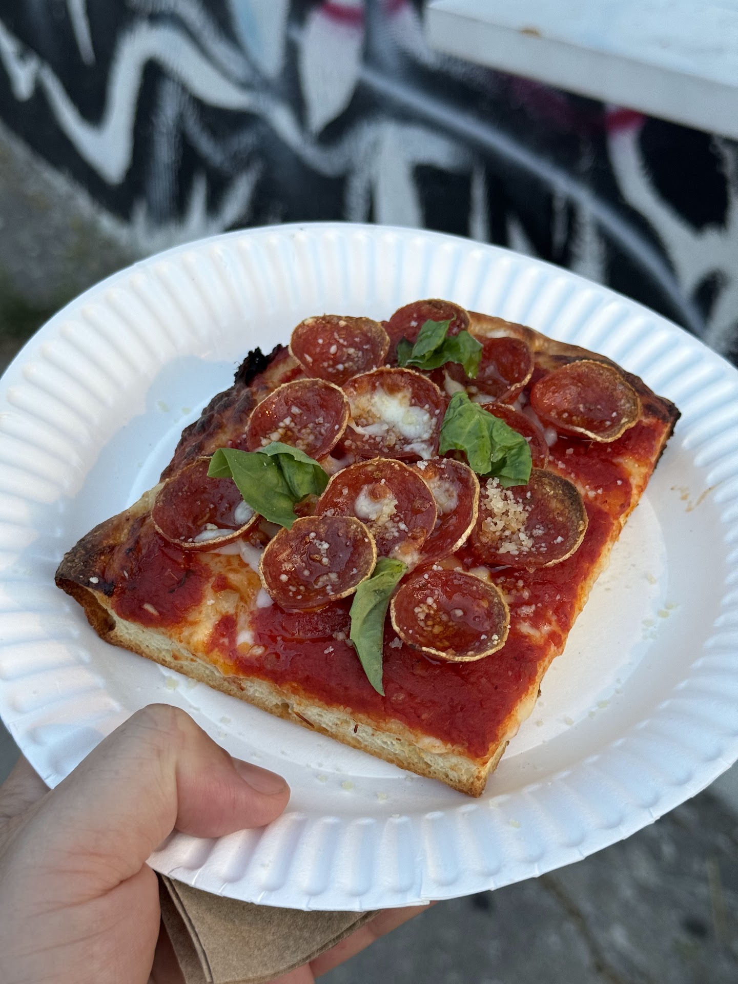 Literal hole in the wall pizza place! But man, their pizzas here are on point! 👉 The pepperoni and thick dough on the Detroit style pizza was amazing! Drizzle some hot honey and ranch jalapeno and it even kicks it up a notch higher. The owner is so friendly and even gave us an extra free thin crust pizza to go. For dessert, the banana bread pudding is so rich and heavenly! It's amazing how the bread on top is not soggy at all. Perfect amount of caramel on top. So decadent! :D There are no tables with chairs to eat if you dine in but if the weather is nice, you can eat at these small shelf tables on the side of the building. No parking lot here but you can easily find street parking around the nearby...