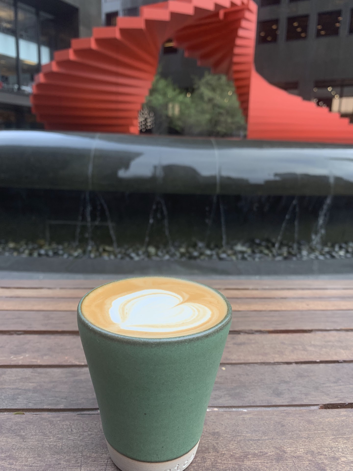 The coffee shop is housed in a stand-alone structure in the center of City National Plaza. The shop has a neat, modern look with straight lines, steel beams and wooden counters. The shop leverages its central and easily accessible location by opening up all sides of the shop and providing plenty of seats, including a bar top on one side. When I first visited the shop one early morning, I saw someone in a suit eating his breakfast by the bar, chatting with the baristas while sipping an espresso. Another time I stopped by near lunch time, there was a little crowd around the shop and conversations were everywhere. The open air must give people who work in an office the real break they need.