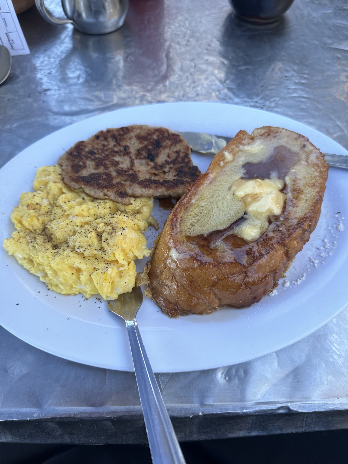His dish, the chilaquiles, was also disappointing—lacking in sauce, meat, and flavor. After a few bites, he pushed the plate away and refused to finish. As for my French toast, by the time I got to it, the interior had become soggy and unappetizing. I only managed to eat half of one slice out of the three.