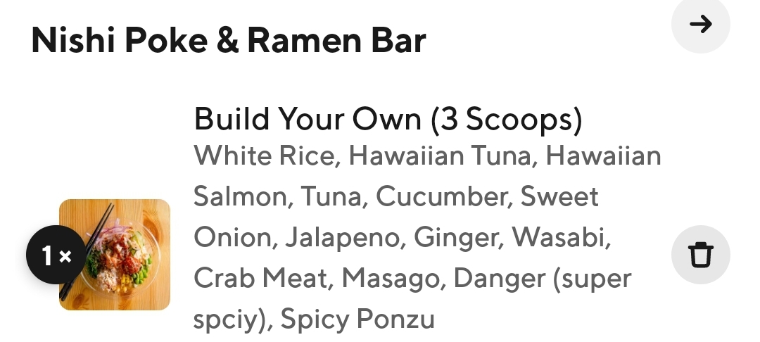 Read moreI’ve never been to the actual restaurant. I ordered poke bowl through Door Dash. I had 3 scoops BYO bowl for $11.99 which i thought it was actually pretty cheap.