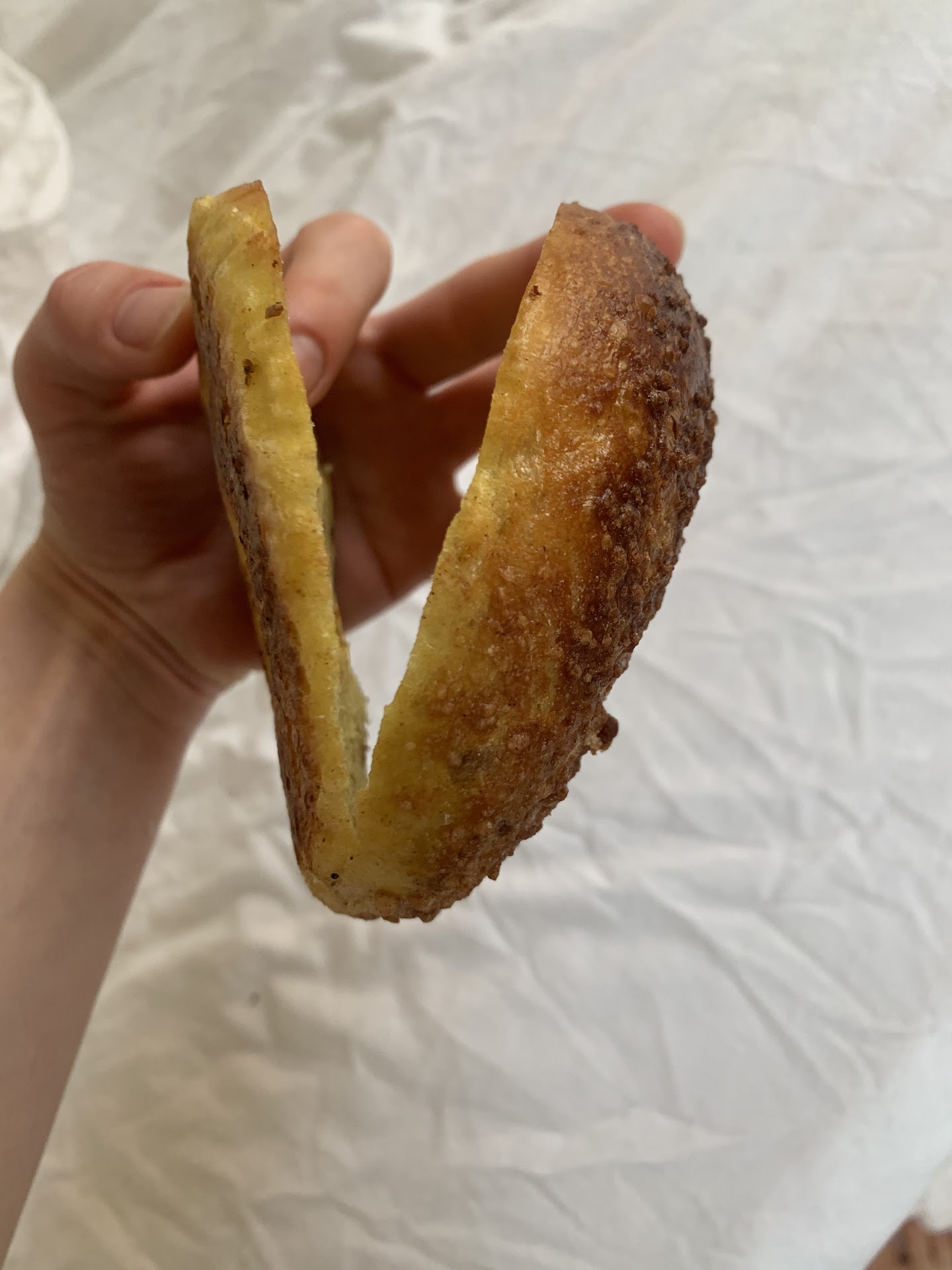 When I got home, I was putting cream cheese on my bagel and found black and brown chunks of other food remnants in my cream cheese… gross. Also the way my bagel was sliced was a literal joke, so thin on one side. My BF also got a bagel sandwich and the bottom was sliced so thin.