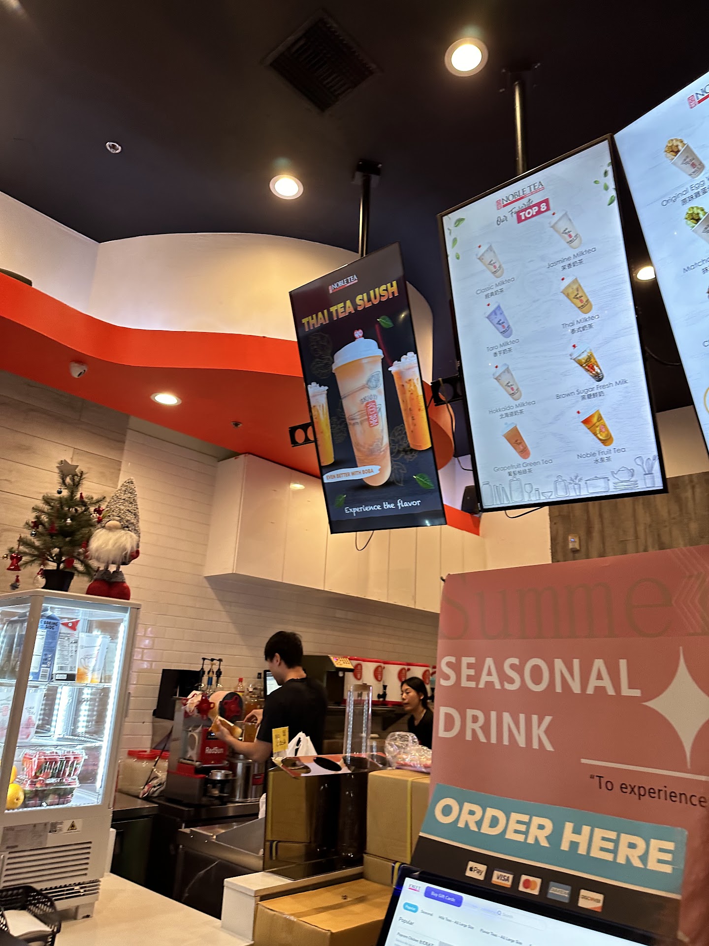 Read moreNoble Tea offers a wide selection of drinks, from classic milk teas to refreshing fruit teas, along with light snacks such as popcorn chicken and waffles. The shop has two self-ordering kiosks inside, which makes the ordering process quick and convenient. While there are no tables inside for dining, there is an outdoor patio in front where customers can sit and enjoy their drinks.