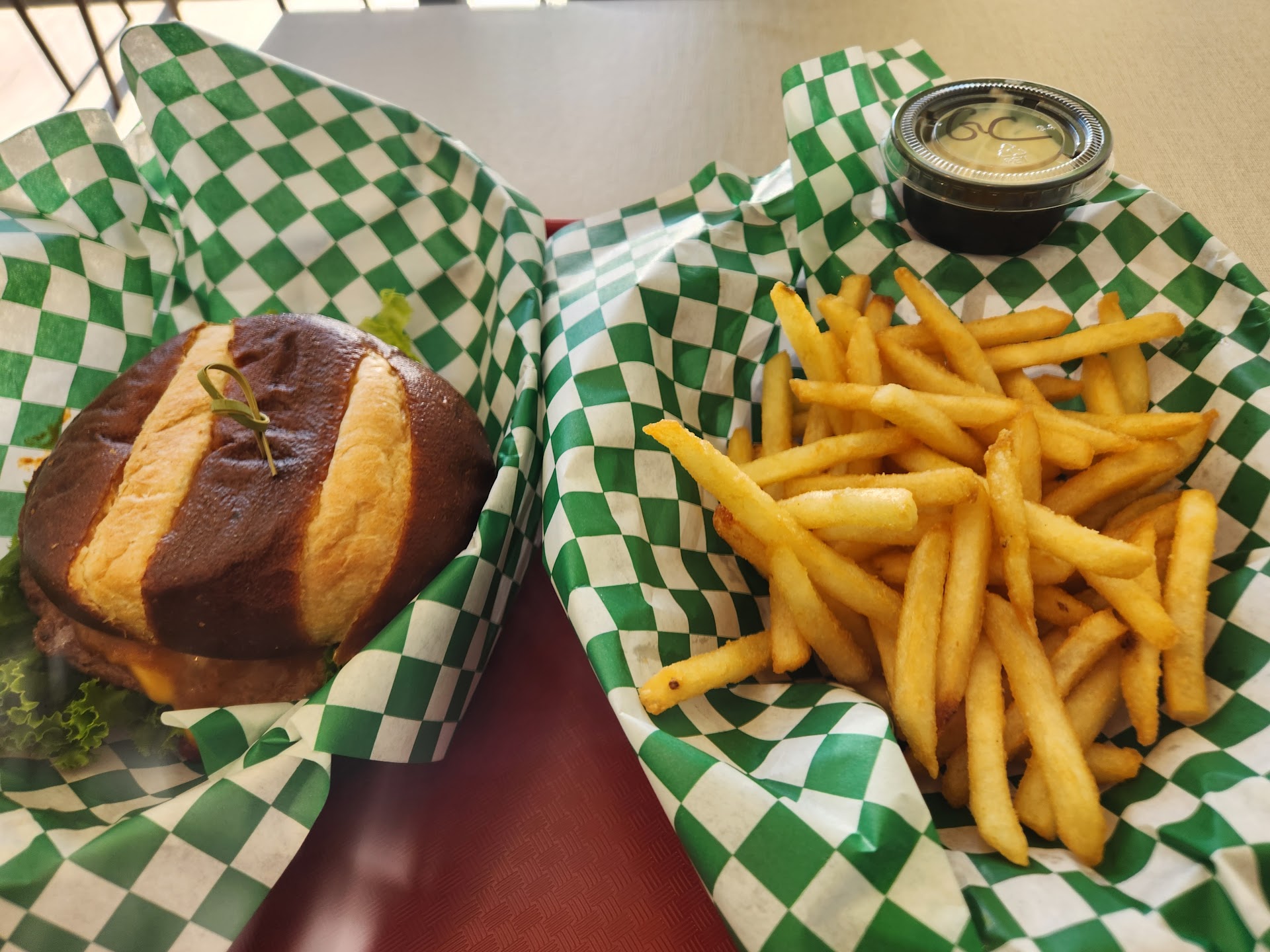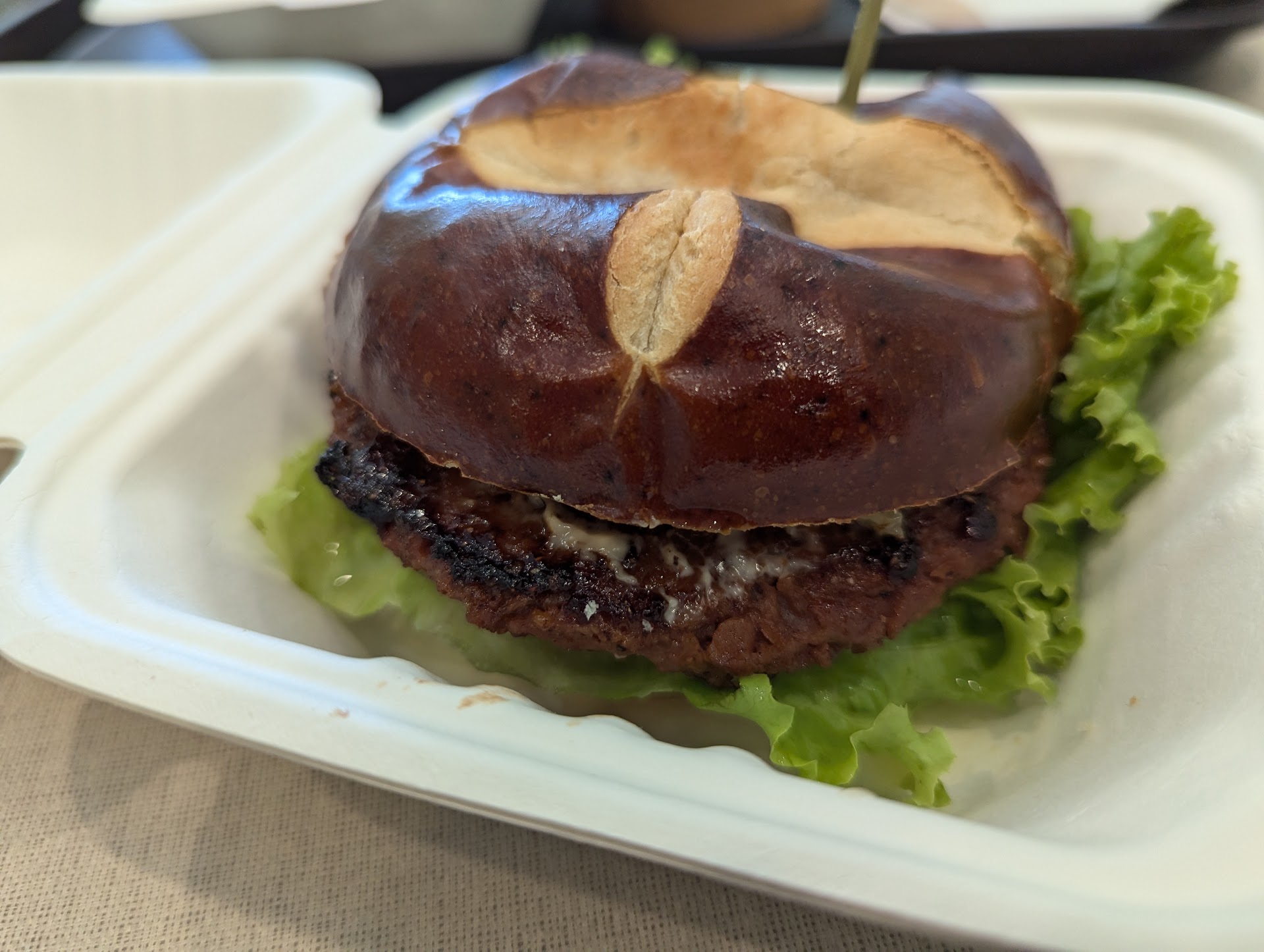 I ordered the Beyond Burger served on a pretzel bun. The thick sandwich is topped with sliced tomatoes, shredded lettuce, chopped sweet onion, cucumber slices, and vegan salad dressing. The generous sandwich was delicious.