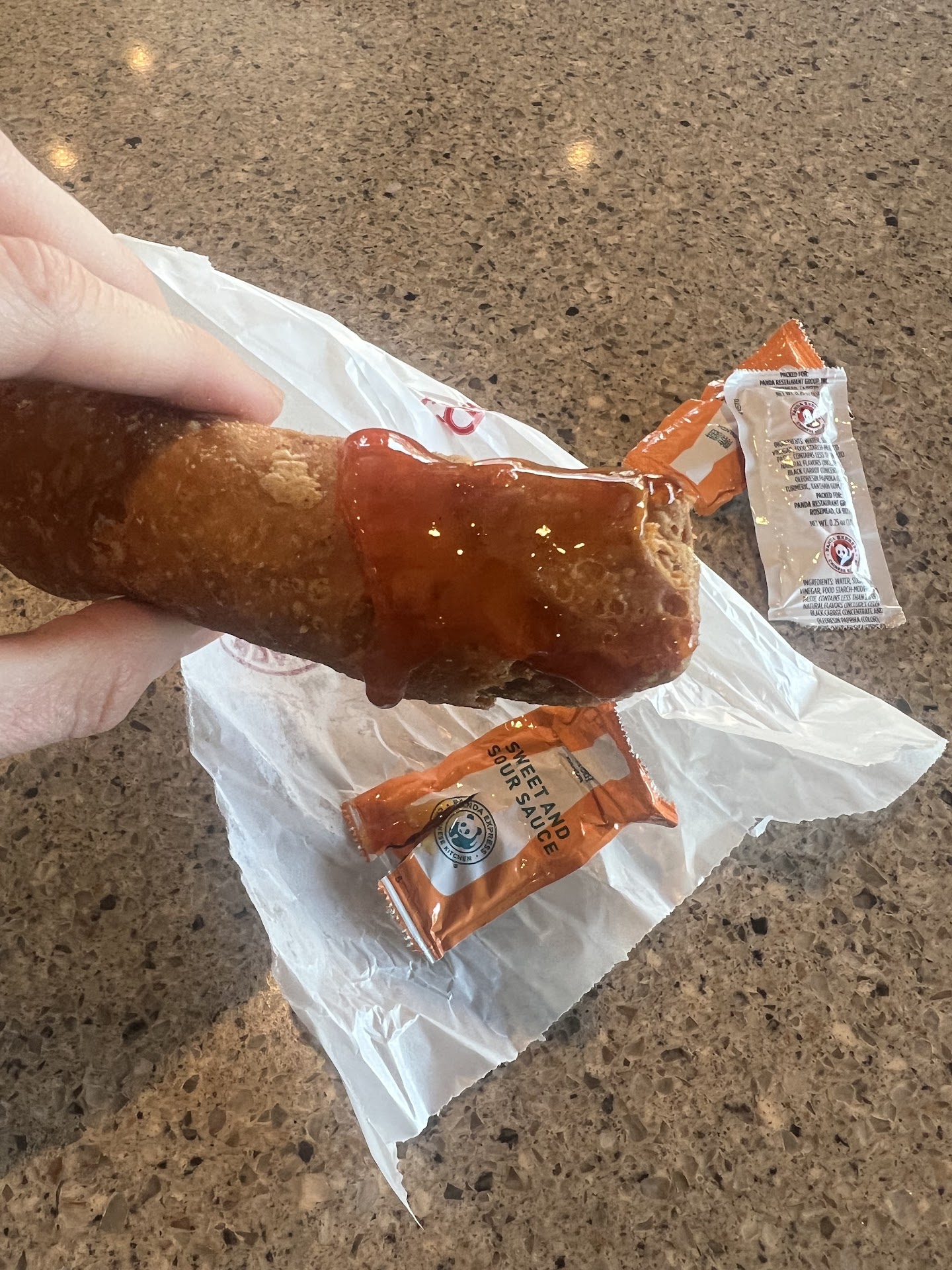 The cabbage (or at least I think it was cabbage?) was pretty soggy and overall the food was very heavy. I got one of the last 3 chicken egg rolls and it tasted like it had been sitting there for a while, and it was so dry I needed about 4 of the sweet & sour packs to be able to eat it. While Iâm really glad they have a vegan option, the Beyond Original Orange Chicken had a very unusual soggy chewy consistency and wasnât even close to the original in my book. I was going to get the beef & broccoli, but it looked very unappetizing in the tray (the beef looked gray) so I went with the asada steak instead.