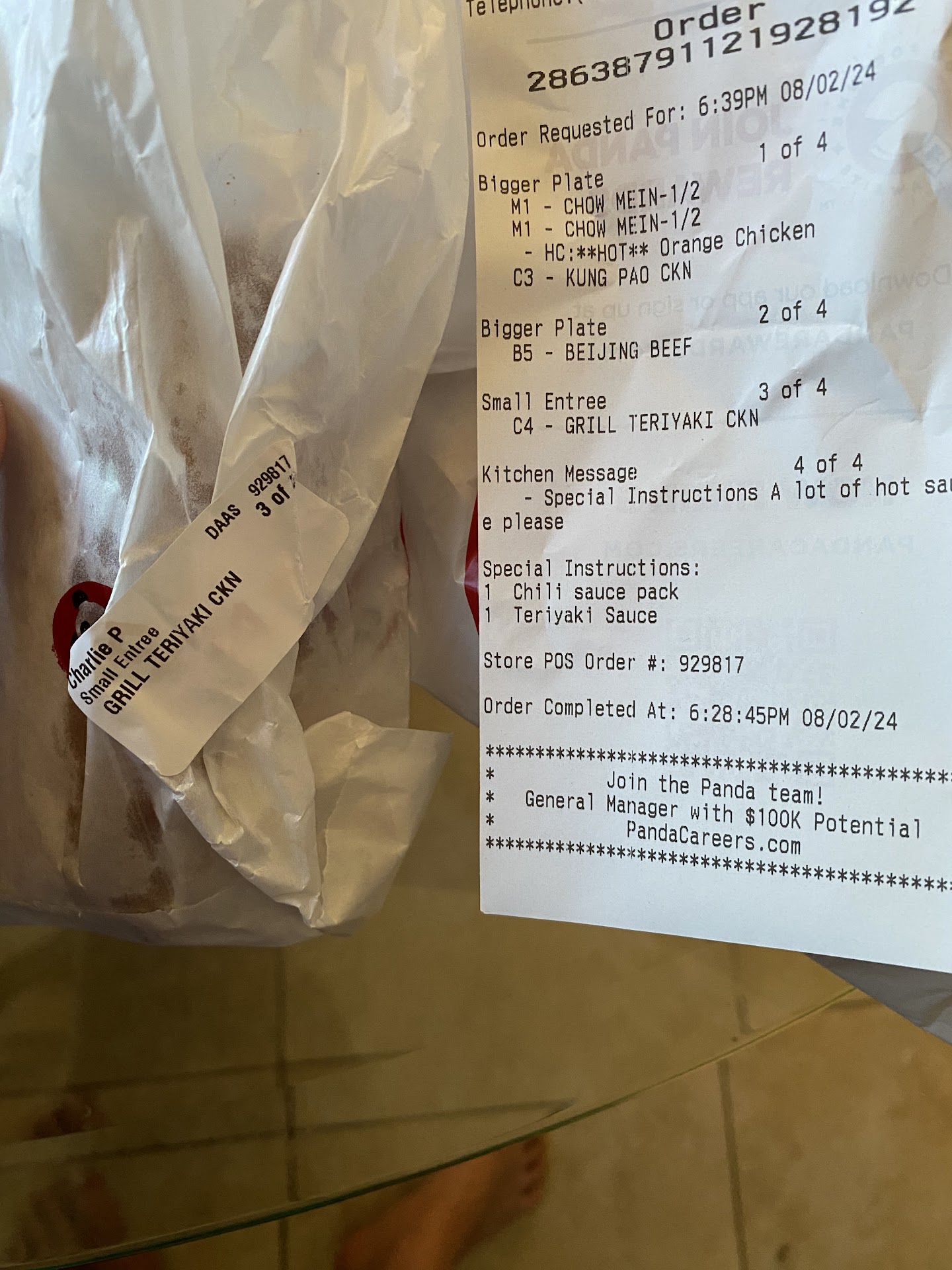 Read moreWorst Panda I have ever eaten at. I would rate lower but can't. Went an hour and a half before they closed. They stopped making food. The lady behind the counter stated, they made orders when people ordered them. It took me almost an hour to get food. At least 8 people and a door dash driver were all waiting. The trouble was they served food that was already made to get rid of it, while you had to wait for the rest of the order. The already made food got cold. She yelled at the cooks in front of the customers. She would order 1 serving of an item, then split it in two orders. Everyone else were busting their tails off and she treated her staff poorly. Terrible way to manage her crew. They probably have a high employee turnover rate. I would not go there again, especially if I saw her working. The orange chicken and chow main tasted burnt, but we were starving by the time we got home with the food. I understand they were probably trying to save $, but it's like $10 a plate, should have been managed better. More people kept coming in, so they probably could have sold what they made. Total...