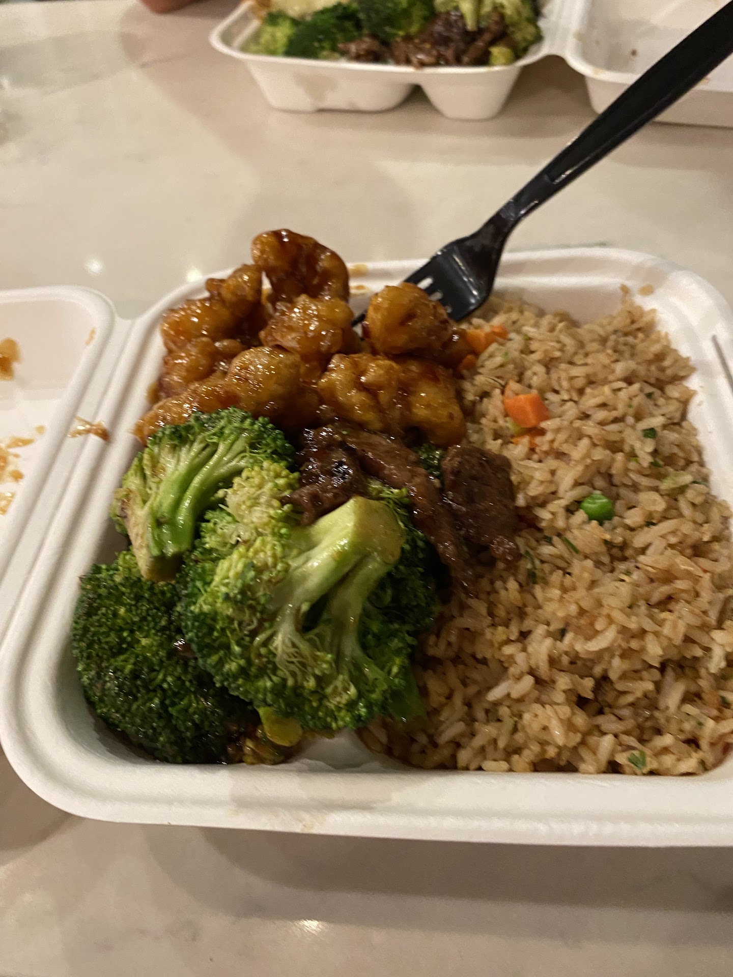 I got all fried rice with broccoli beef and orange chicken. I drank the mango passion tea. The orange chicken was phenomenal. It was crispy and crackly and crunchy and the orange flavor was on. The broccoli beef was equally well prepared. Amazing!