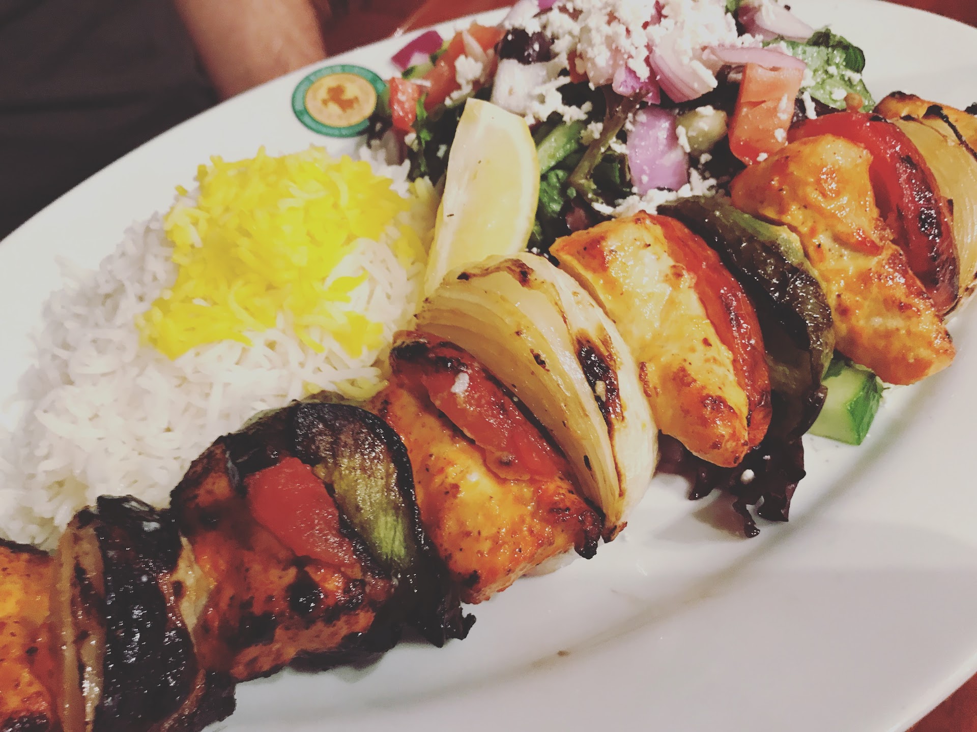Entrees Beef koubideh kabob was excellent with fluffy, tasty rice. The salad was un-eatable. I hate wilted gross mixed greens. Yuck!