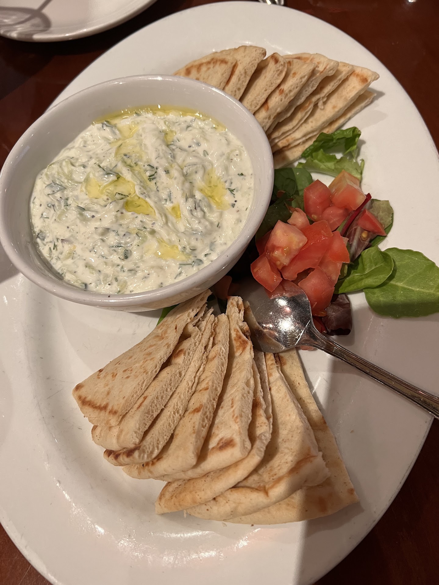 Appetizer combo platter was sorely lacking. In Glendale the plate is covered with 3 kinds of hummus, falafel, caprese, salad and some pita. The food was overflowing the plate and you could just eat that and be full. Here not so much. Hummus was ok. The black bean one is not great. 3 little falafel balls, and 2 caprese stacks. And a lot of plate in between. The pesto on the caprese stacks was outstanding.