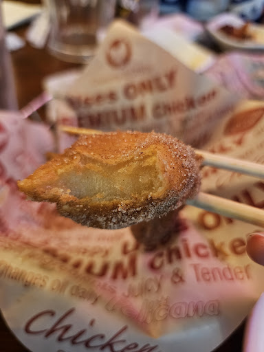 Twisted donut: wow! I didn't think I'd like it since I was so full from the chicken but this was darn delicious! It had more of a rice cake (dduk) than your typical donut texture so think of it like mochinut. It was served warm, freshly fried, coated with sugar and cinnamon. Yumz!!