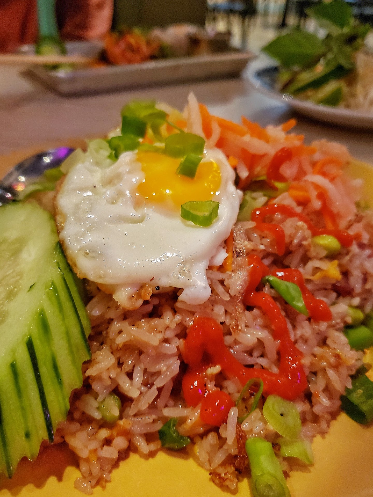 Oh and the drinks? 5 for damn Coffee and 5 for "Thai Tea" Can we please have cheaper options? Y'all can be defensive and say "Oh would you like a Refund?" YES, we would like a Refund Thank You.... 2 Stars... 1 for the Tea with the floaty cream and Boba... Oops... Boba is an extra .50 cents??? WHY PLEASE? Tea is $5 give us Free Boba... Also nice room and there's a nice mural to stare at while trying to eat.