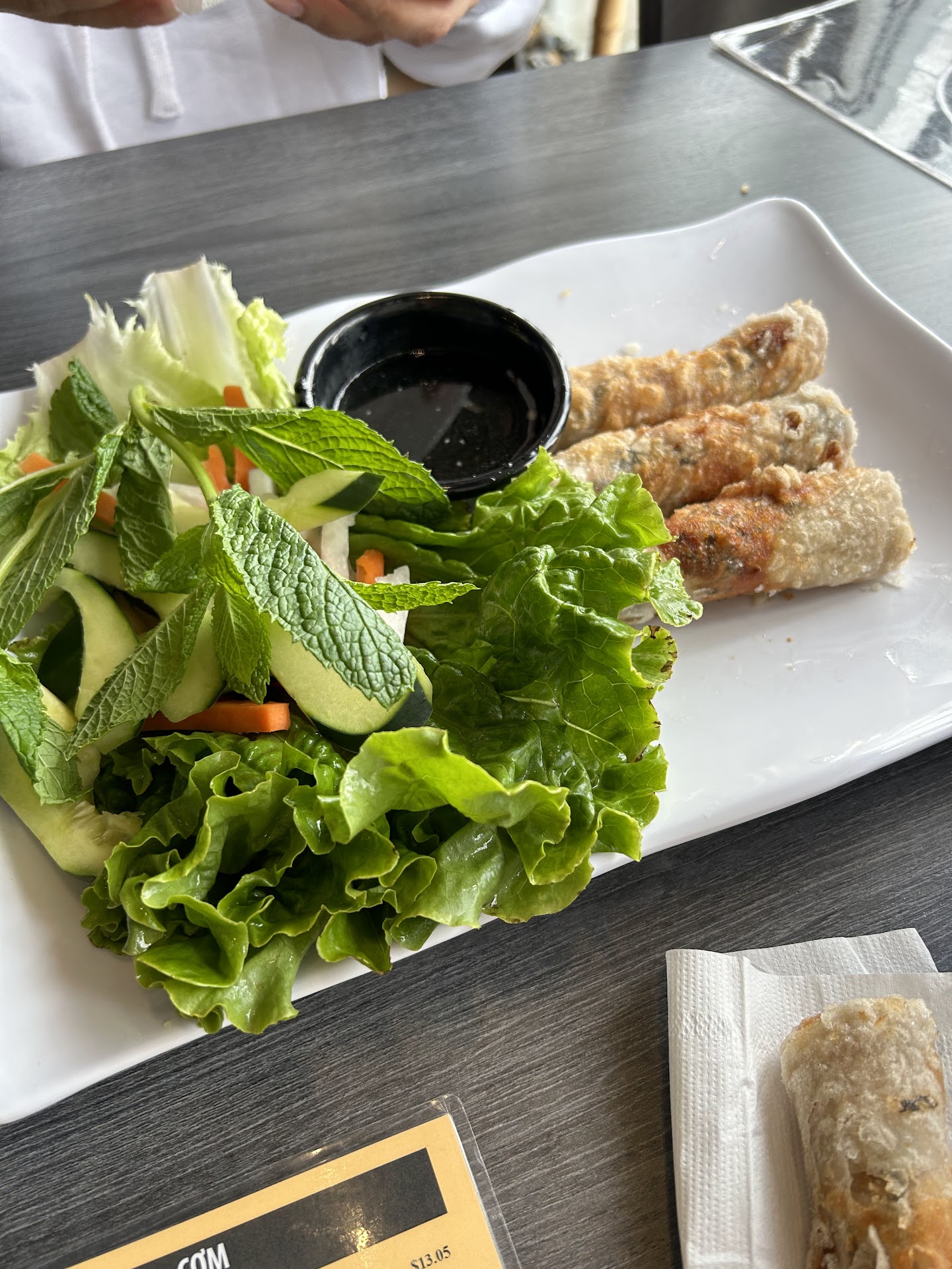 First of all, they're sad excuse for a spring roll is basically 90% lettuce, with three SLICES of shrimp on top. They don't even give you full shrimp! They take the shrimp and cut it in half, so basically you're only getting one and a half shrimp per spring roll.