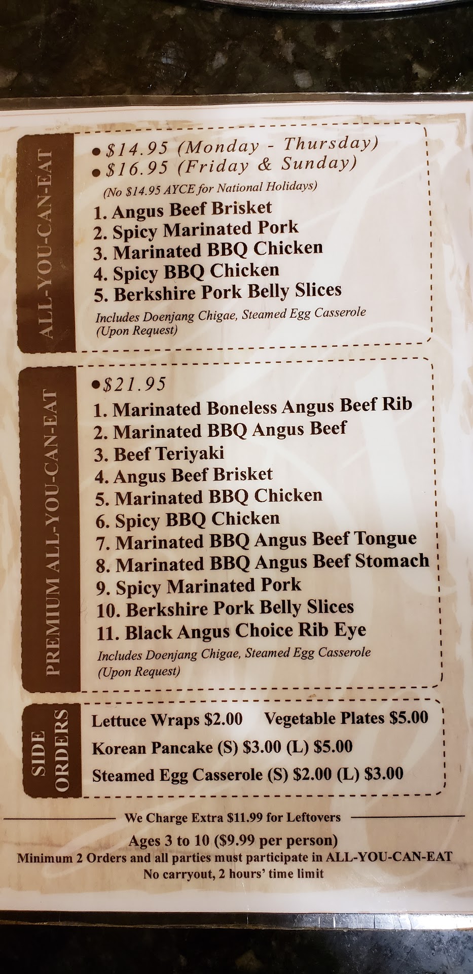 Read moreIt is the worst place to come too for All you can eat , unless you're of their kind you will not be served the same portions, I this because in our are our server had to pass us to serves those seating around us and they never attempted to flag yet when we did she literraly acted as if we were not there. We litterally were ignored , plus the portions were so paper thin it looked like a little kids portions once cooked (a little handfull once cooked). Then you get the worst look of death when you ask for a second round , you will get served a small salad plate just for asking. Then the lady (owner I believe) will come and lower the heat to bare minimum so it takes forever to cook so that when you do get the second portion you get fusterated and decide to just leave and not ask for anymore. I kidd you not, even the male at the register, when i told him it was hard to get our servers attention he's like "yeah I know and ducked his head while swiping our card" I also told him the portions where extremely small and thin and that the lady wouldn't come around when flagged but then again he noticed it cause we sat in front of the register. Fusterating ! Don't go here! Oh and the marinated spicy pork is so thinly sliced it crumbles and chars so fast....