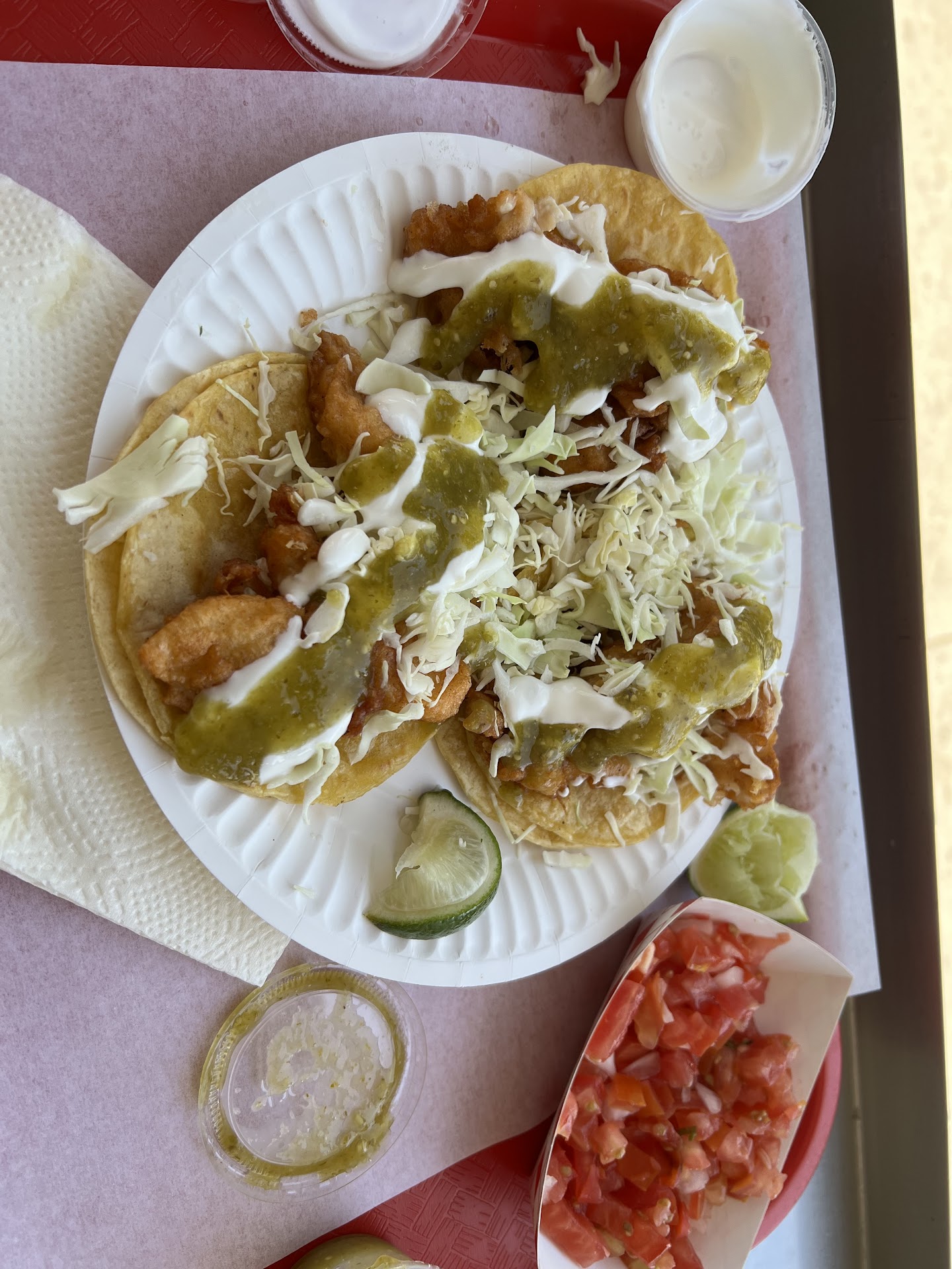 Read moreI went thru the drive thru. The staff is hard working and polite . The atmosphere was friendly and well lit. I ordered the two fish taco combo w a drink. It took me back to the days at ensanada when I would sit next to the woman deep frying these delicious little fishes lightly battered in seasoned flour and cooked right in front of me to perfection then served on a corn tortilla with lime slices and tomatoes onions and salsa and topped with table cream.. umm delicious. The fish portions are plenty enough to actually make two more tacos if you use only one tortilla instead of two. If it seems to fall apart before it enters your mouth your being dainty . This is no time for that. Get both hands involved and cradle it as you shovel it into your mouth. Have the plate below your chin to catch the pieces that fall overboard. Then use your hand as a scooper and pick up what didn't go in and finally lick your fingers and get the next taco ready to eat . Repeat the process until their is nothing on the plate. Finish it off with the drink and chips that come with your order . Wipe your hands with the napkins and you did it. I hope you enjoy it as...