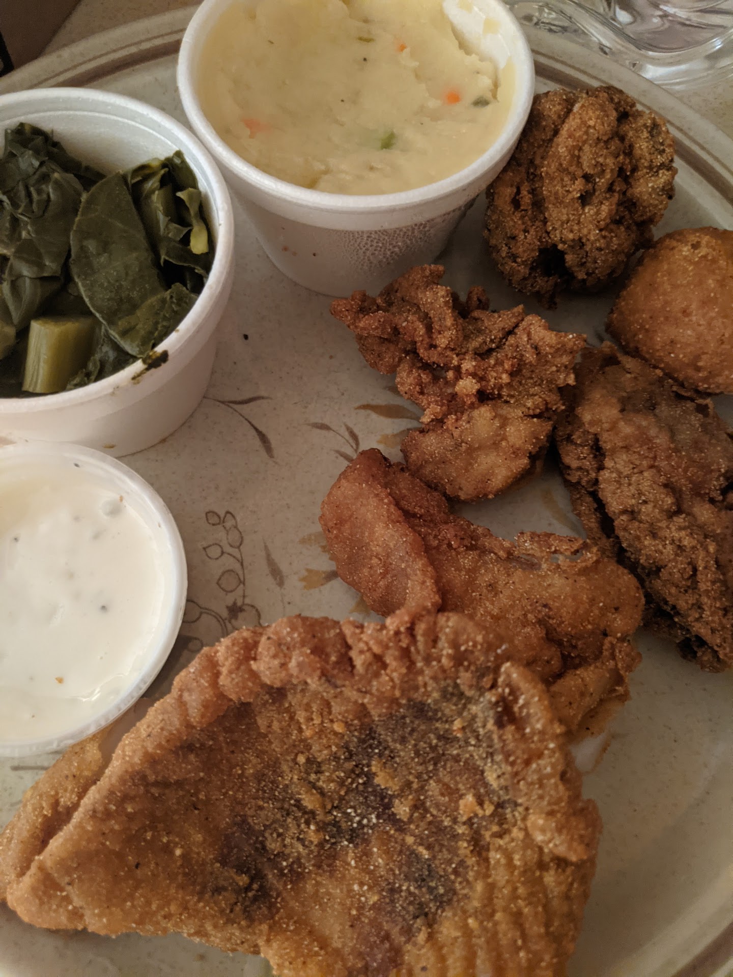I ordered a combo of fish fillet and oysters, it comes with two sides but the size of the size is just a small scoop. I ordered veggies and a salad it was to go so it wasn't very accurate I ended up with mashed potatoes instead of the Mayo salad and the colors were just simmered and very bitter nothing no seasoning. The fish was good, I've been wanting oysters for a while but I didn't expect them to be breaded it was something different to try so the plus was the oysters the fish was okay but for me it was a bit dry and the order was cold so I cannot tell if it tastes better. It came with two tar dips and hot sauce. The order was scrambled into a foam to go plate so it wasn't a good presentation and very cold I cannot tell how she can taste better dining at the place. The scoops were definitely not the best sides I could not eat the colors so I do not recommend that and definitely the portion was extremely...