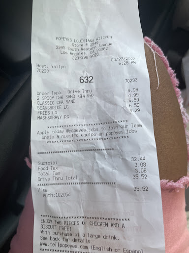 Read moreWell second time we go in and food cold food order wrong people including shift manager cussing in from of all the customers place dirty.. last week too there’s not too much to eat off of Western in Martin Luther King so we go frequently but these last two visits I’ve been horrifying I found out the district managers name is Elaine and the shift manager for today was Maya all these transactions are actually on my bank card so I would love to speak to somebody to find out if this is a franchise or privately own Popeyes because this treatment is unacceptable after we spend so much money in these fast food restaurants yes it is by choice, but it also is of necessity no one wants to work all day and come home and cook so we go to Popeyes but clearly we have to pick another establishment but the reason why things don’t change because nobody says anything or follow through. I really wanna follow through so if there’s anybody that knows, please...