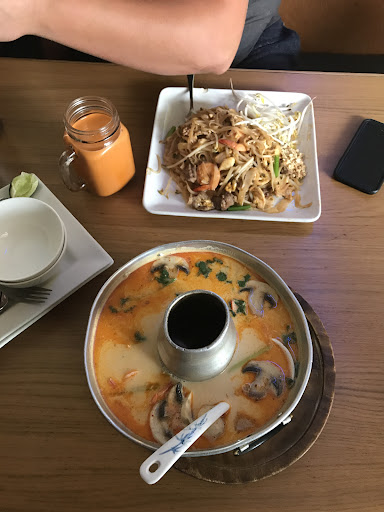 I would definitely come back here - food was exactly like I expected it to be. And the atmosphere is cosy. Price is ok. Small cafe, just few tables available. A lot of free parking place on the plaza. I ordered Tom Kha Kai - it is coconut soup with a choice of chicken or shrimps (I prefer a little bit spicy and with shrimps), mushrooms, lemongrass and ginger. The size of a portion is big enough for 1 person. Also I decided to try Green tea ice cream and I liked it! I was totally satisfied with my lunch. My hubby tried Pad Thai - it is thai rice noodle fried with a combination of chicken, beaf, pork and shrimps with fresh bean sprouts. He also was excited about his food (said just he would add a little bit more shrimps, cause he had only 2 of them on the plate, he expected some more...). Also he ordered Tapioca with Thai iced tea - taste seemed authentic to us :)