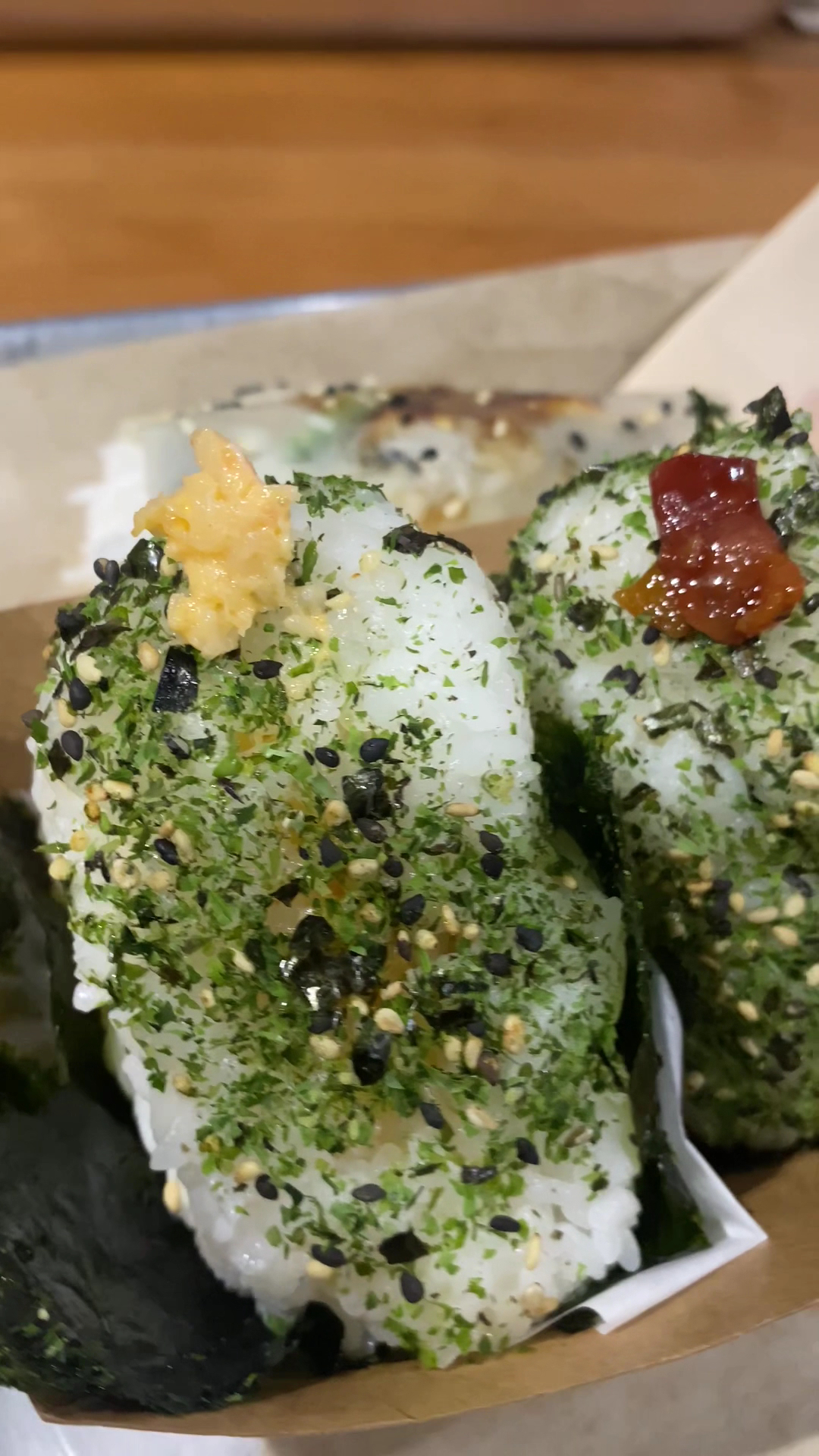 Food and Drink. Ikura Mentaiko Onigiri: Easily the king of the meal. Served warm in paper with some ikura on top, you bite into the slightly salted seaweed into warm and a savory flavor experience with tasty warm white rice, ikura stuffed inside along with mentaiko that's very flavorful without the "funk" flavor that you can sometimes get with mentaiko. I love strong flavors and this was so satisfying. After we ate our first round we both agreed we had to get another Ikura Mentaiko onigiri so we did that.