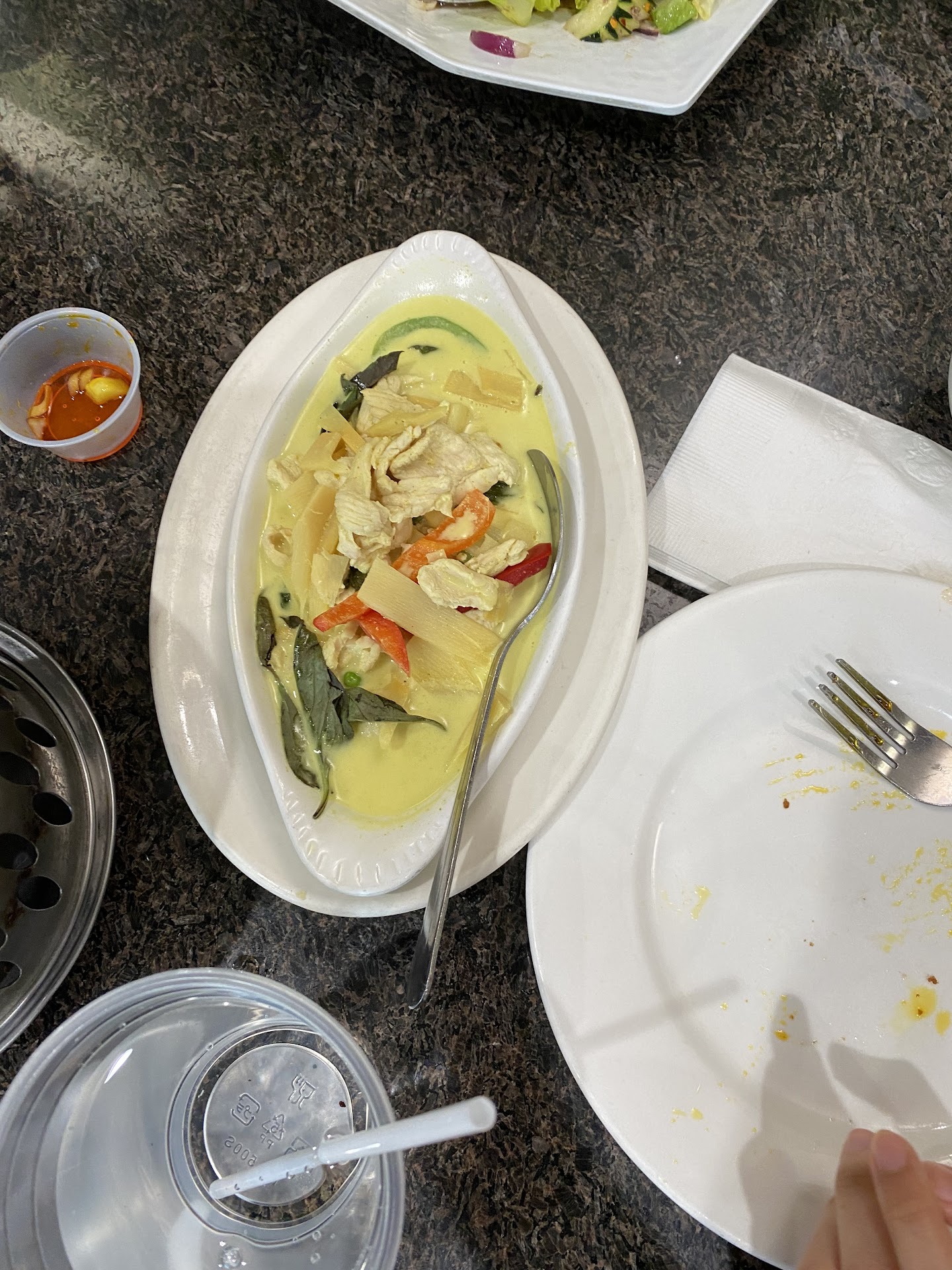 Things we noticed: The chicken vegetable soup that comes out before the entrée during the lunch special is so clear and refreshing. Chicken satay (skewers) that came out with my pad see-ew (good) was almost burnt black. When one of the servers noticed this, she asked if we wanted a new plate and we accepted. This second plate was burnt half black. Portions are still pretty huge. Neither my dad nor I finished our lunch specials. He had the Thai BBQ Chicken which was good. This is not authentic Thai food.