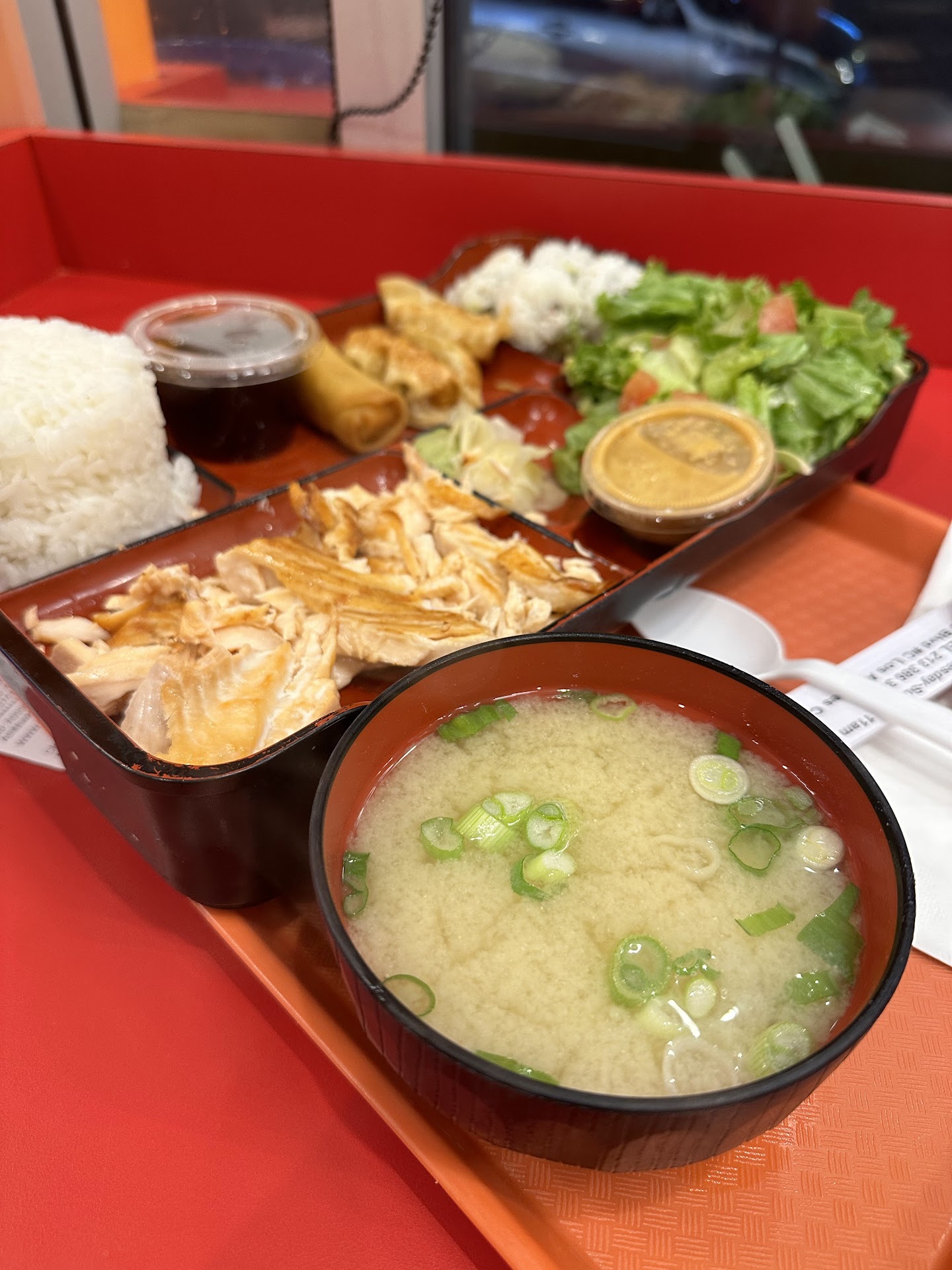The Geisha roll I tried was warm and the tempura surrounding the shrimp in it was soggy, the miso soup was ok just a little too bitter for my tasting, the salmon skin roll I tried was warm as well and had additional ingredients in it I wasn't too fond of, however the tuna rolls were about average. Also for the chicken lovers out there they only serve dark meat in their teriyaki bowls, no white meat. That's a deal breaker for one of my friends.