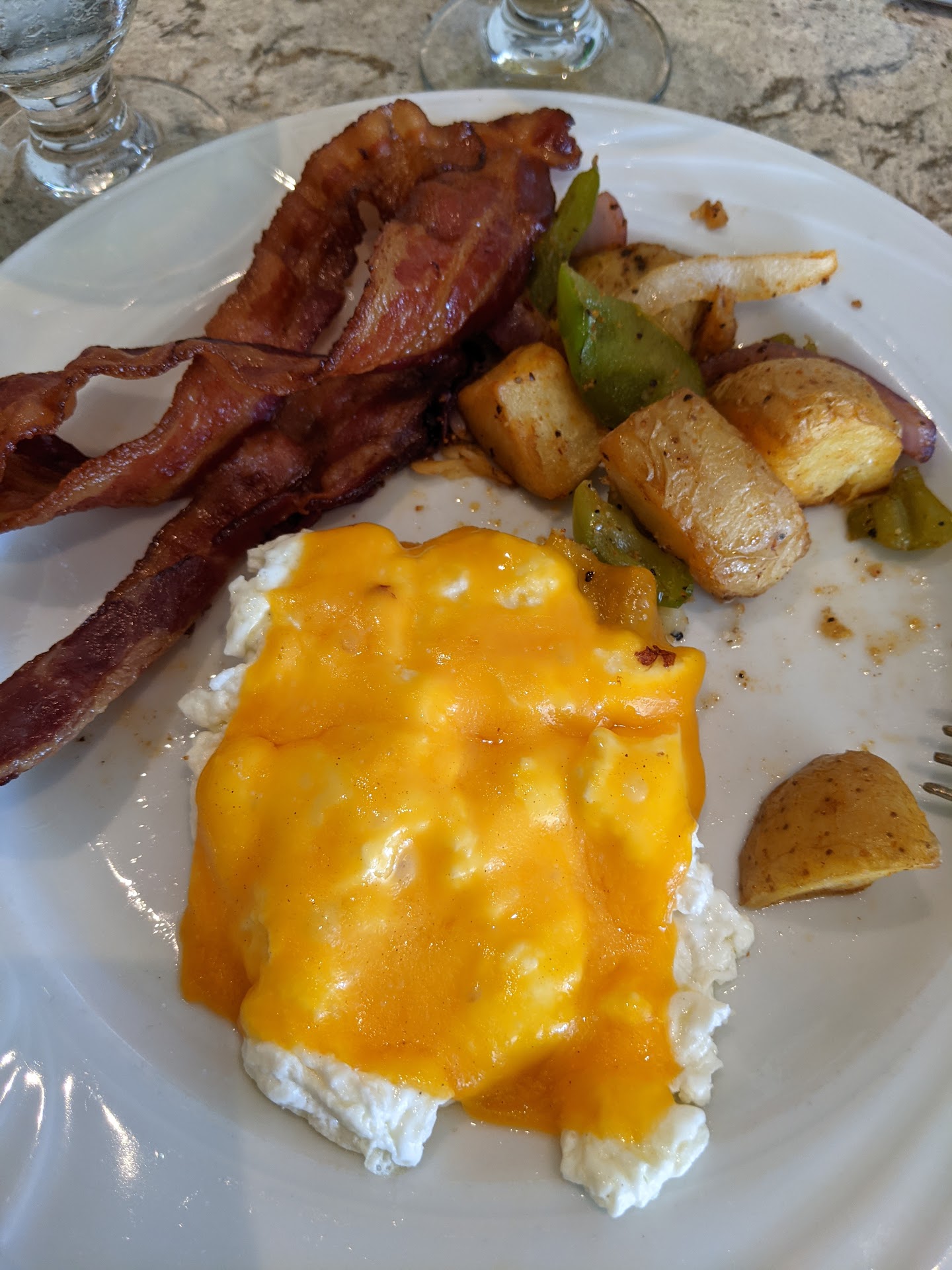 Worst place to have breakfastâŠ.. we were serve coffee in a to go cup while we dined in. Suppose to be a higher end restaurant because the location in Hilton hotel. My husband had sausage links one was edible but the other two wasnât. We were served before the table next to us and they were there way before us. When asked about their breakfast they said it was in a to go bag while they were siting at the table waiting for their breakfast. Are you kidding me???? Isnât it a hint when youâre siting at a table waiting for your breakfast, other wise youâll be waiting for your food before entering because of the pandemic weâre in??? They were finally served with a to go bag and had to plated themselves. We had to ask for water and no refills for our coffee. Like they all say WHAT A DUMP...