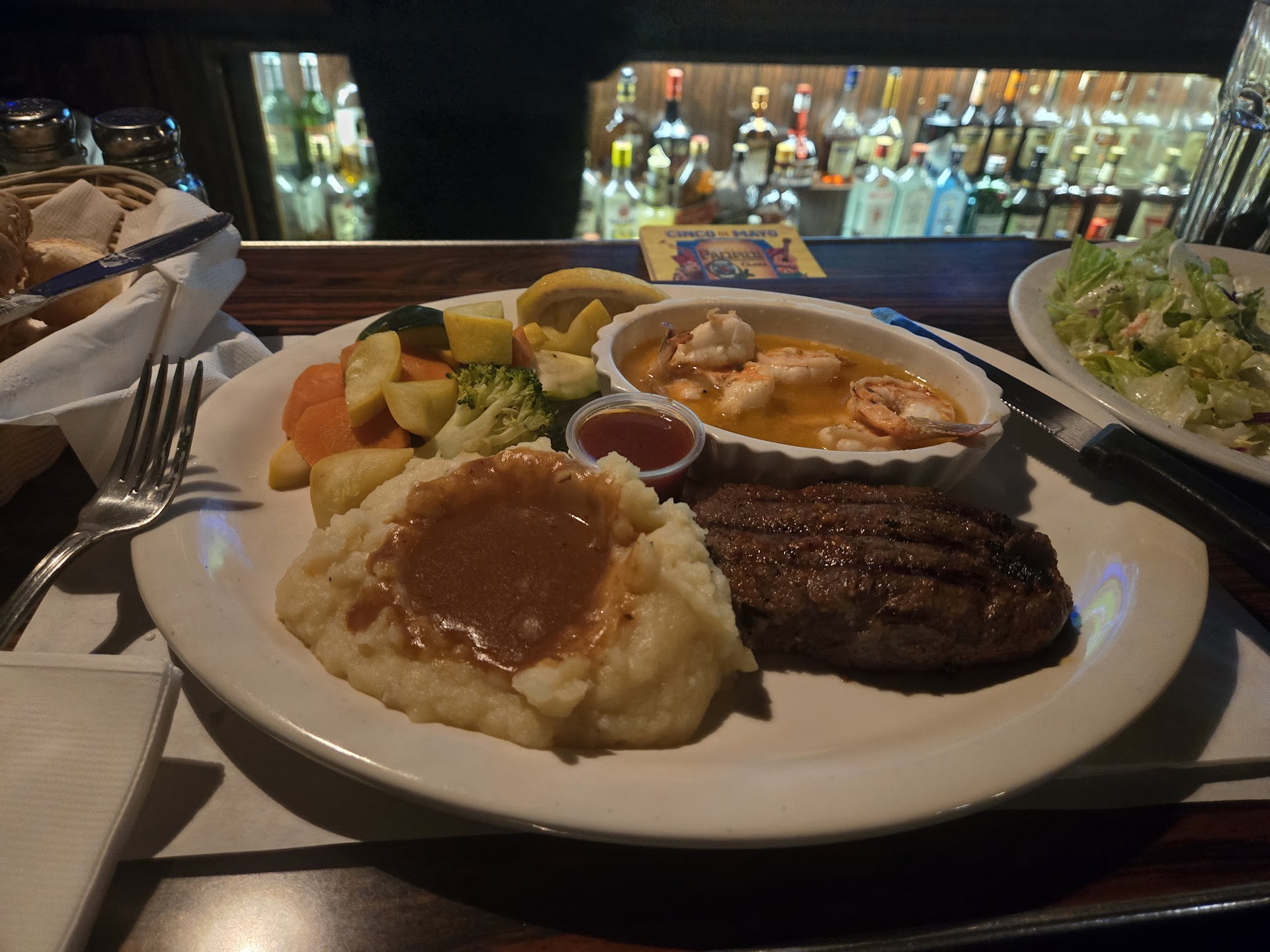Read moreSalad, warm bread, real butter, steak, shrimp, mash potatoes & gravy, and some veggies for $21.99? Hell ya!!!