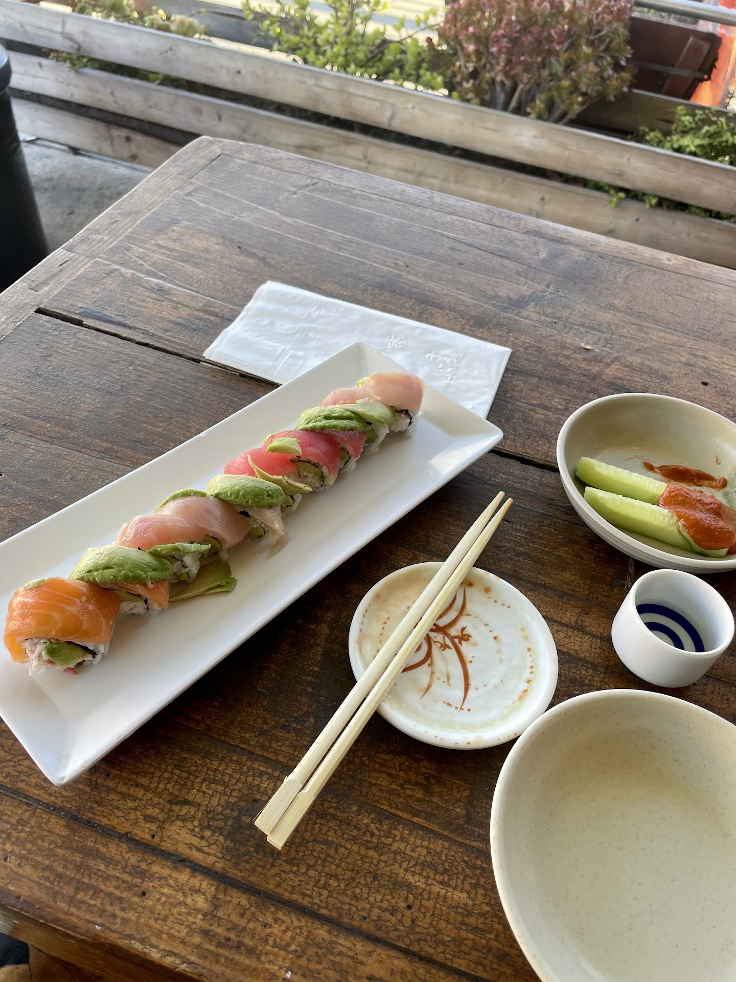 I the rainbow maki roll and a hot sake (of course), while my friends had the Bul Ko Ki w/rice and the Udon. I didn’t taste their food but it was clear that they were as satisfied as I was with mine. That roll was, again, so fresh and surprisingly filling, considering I can take back 3 or 4 rolls before I bow out. Simply perfection. We dine outside since it was a great evening out and it all made for a wonderful time.