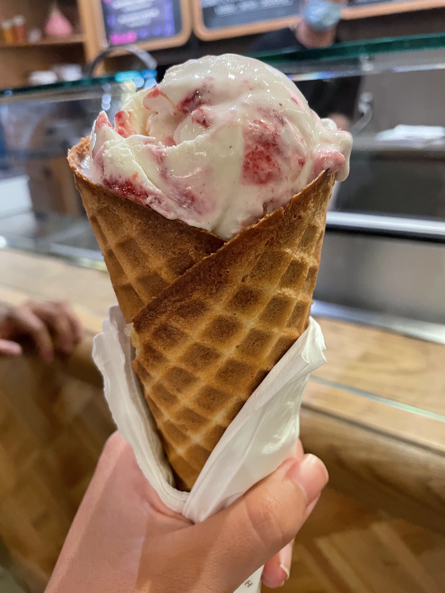 There are flavors that are perennially available as well as a rotating list of seasonal specials. The honey lavender is a good option for something light and always available. This time, I opted for the yogurt lassi with raspberries, which was very tart and creamy. I always get my ice cream in a waffle cone, which are freshly made and have such a delicious crunch. You can also get pints...