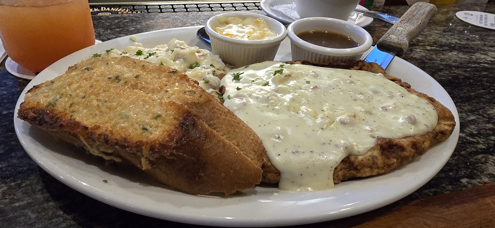 Walked in, hostess was nice, and sat me down at the bar. Whiskey Wednesday and got chicken fried steak that came with creamed corn, garlic bread, and mashers with(soup or salad)clam chowder soup and a california slamer for a drink. California slammer was nice and complimented the food, not too sweet and just enough alcohol. Clam chowder soup was delicious and creamy, full of flavor. Usually, I'm not a fan of creamed corn, but I tried it just because it was actually pretty good. I'm not sure I'd purposefully order it again, but if you like creamed corn, definitely good. Garlic bread and mashers were both sooo good. Both garlicy and buttery delicious, would 1000% recommend try l. Last but not least, the chicken fried steak and gravy... Omg it was so good. Perfectly seasoned, full of flavor and just... so delicious. I'm not even sure how to describe how good it was.